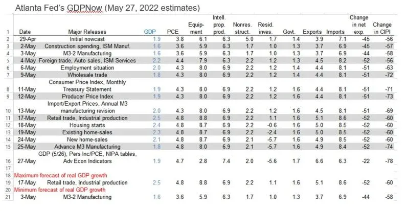 There’s no recession apparent in the May 27 update of the Atlanta Fed’s GDPNow tracking model for Q2. The real GDP growth “nowcast” was revised up slightly to 1.9% (saar). Consumer spending is tracking at a solid 4.8%. Business spending on equipment was revised down sharply to only 2.8%.