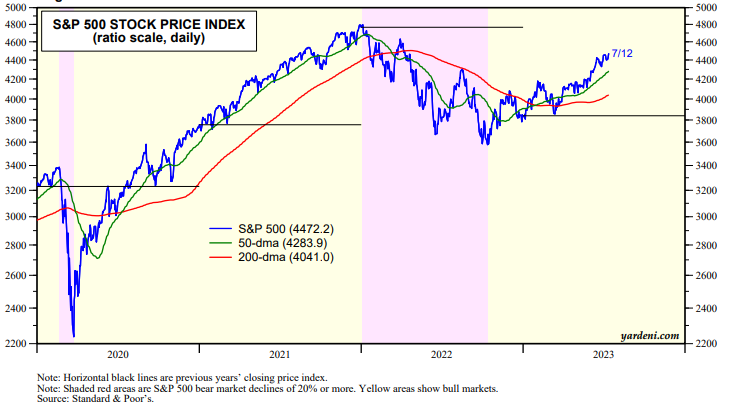The S&P 500 climbed to a new bull market high today of 4472 (chart). It is now 10.6% above its 200-day moving average. It is climbing along the upper end of its bull-market channel. Today's CPI news helped to alleviate fears that persistent inflation might force the Fed to persist with rate hiking resulting in a recession. Inflation seems to be more transitory than was feared last year and even just before June's disinflationary CPI report today.