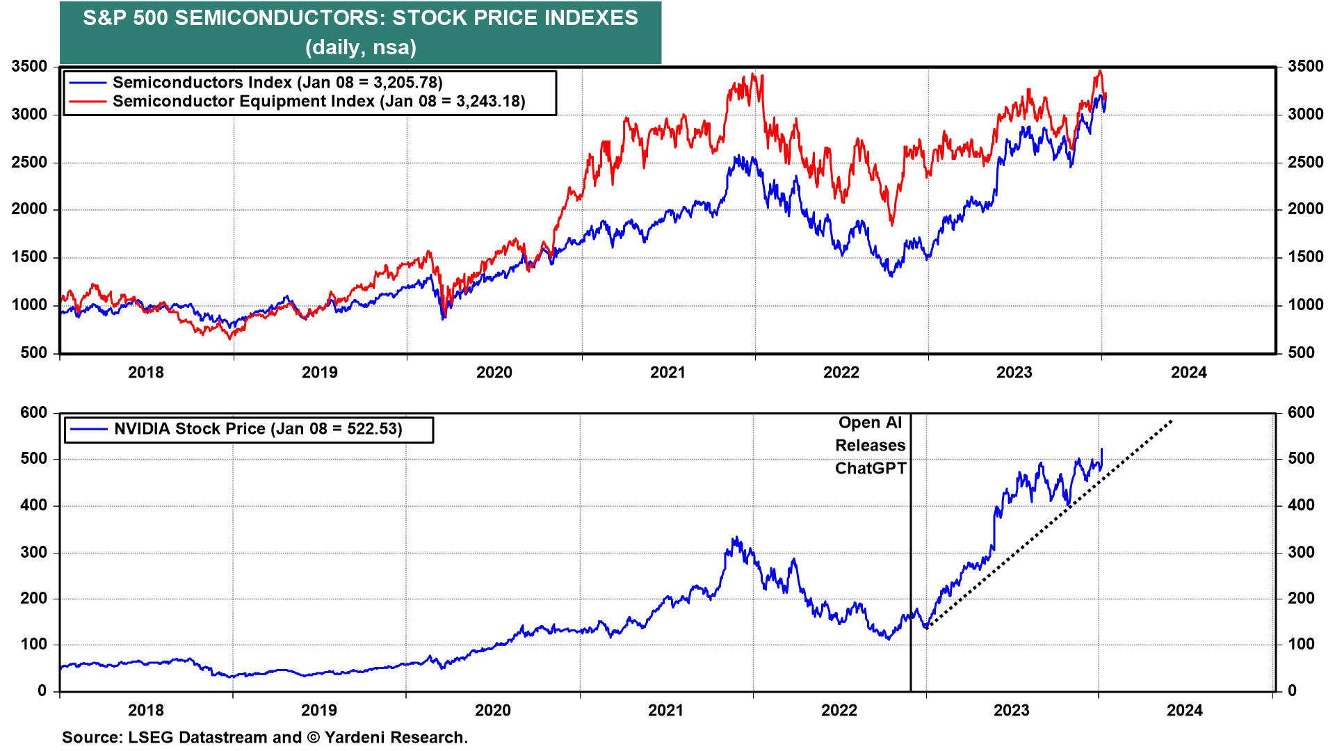 Semiconductors and related technology companies are benefitting from the enthusiasm about AI. Is it hype? Could we be in the early stages of a Nasdaq meltup like the one that occurred during the second half of the 1990s? It's certainly possible. I was recently interviewed by a reporter for a major newspaper in Korea. He asked me lots of questions about AI because Korean retail stock investors are very enthused about the prospects for this technology.