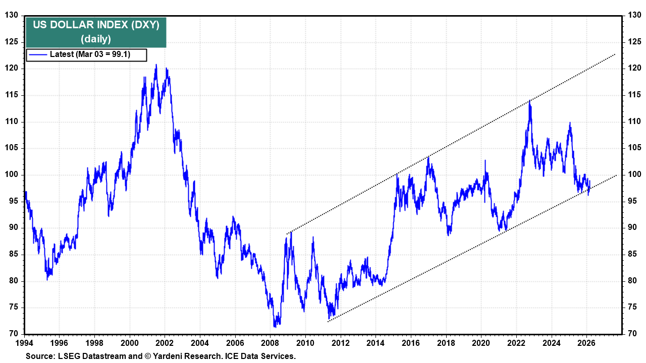 Also, our Go Global rebalancing act might be upended for a while until a credible ceasefire is reached. Overseas stock markets have been hard hit by the war. For starters, the war shows that the US dollar remains the safe-haven currency of choice (chart).