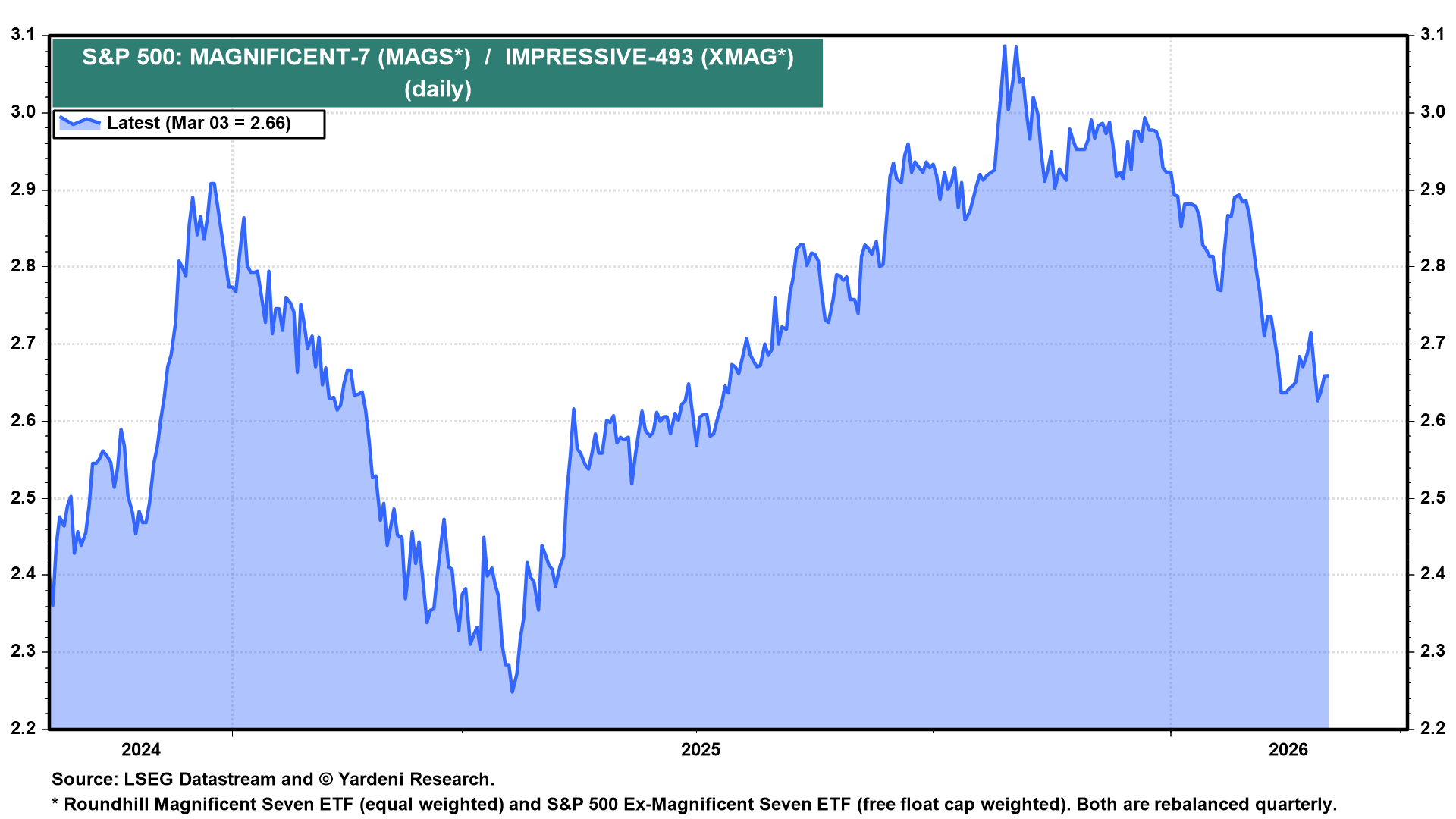 There may also be a short-term reversal in the domestic and global rebalancing trade that we predicted on December 7. It was working, but it is already being upended by the war. If recession fears start spreading, the Magnificent-7 could outperform the rest of the S&P 500, as they did today (chart).