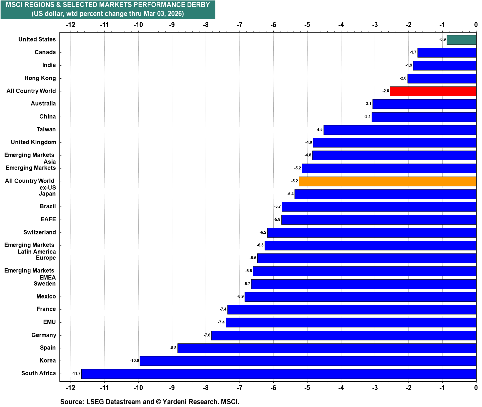 Many emerging economies are also importers of oil. So they are vulnerable to the latest oil shock. Since the war started, the US MSCI stock price index is down less than the MSCI indexes for all the other countries and regions we follow (chart).