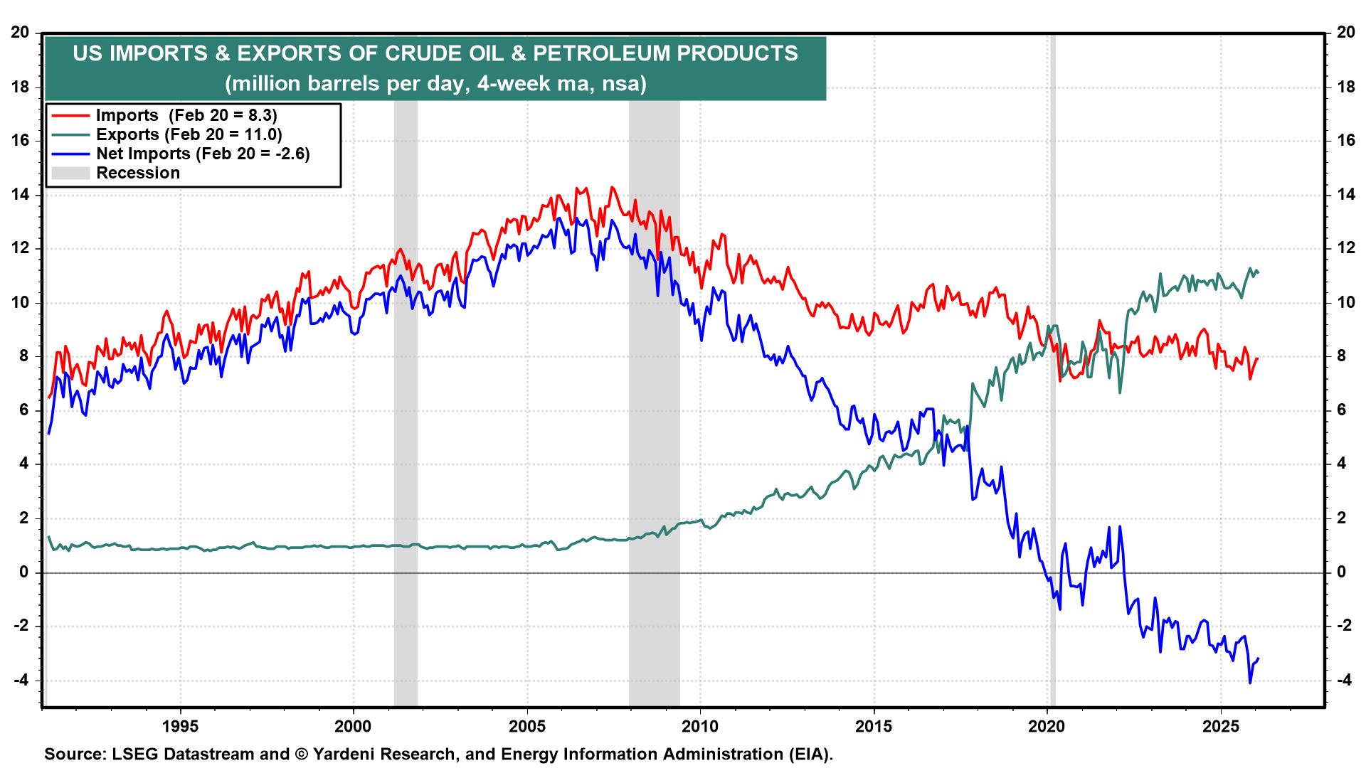 The S&P 500 fell sharply this morning and then rebounded, but still closed down by almost 1.0% and slightly below its 50-day moving average (chart). It is only 2.3% below its record high on January 27. We've been expecting a pullback due to excessive bullish sentiment, but now we expect a 10% correction from the high. It's hard to imagine that the IRGC won't use drones and speed boats to maintain their effective blockade of the Strait. If they are successful in doing so, the correction could be closer to 15%.
