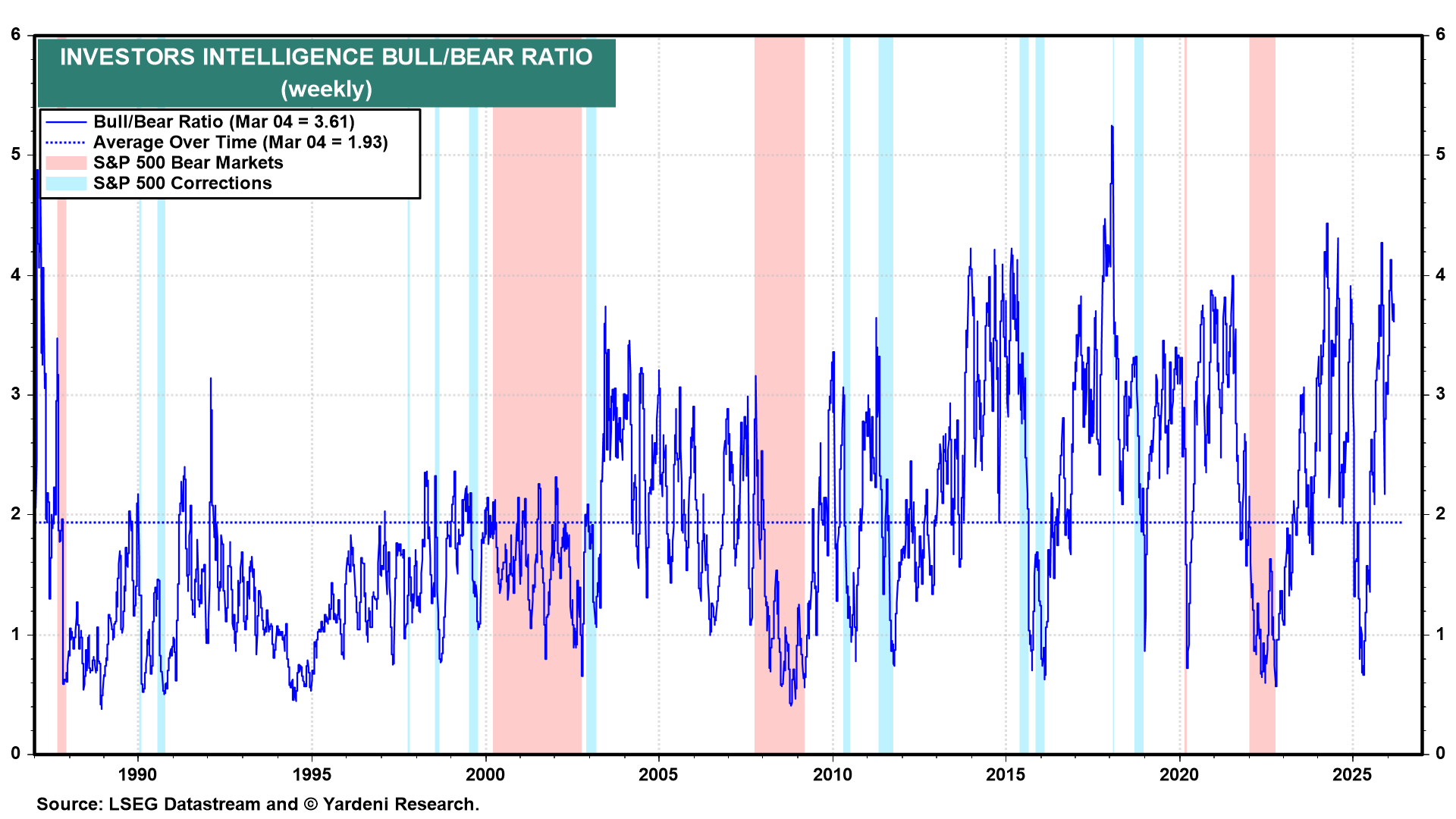 For now, we are also troubled by the latest high reading of our favorite Bull/Bear Ratio at 3.61 this week (chart). We will probably turn more bullish when investors turn more bearish.