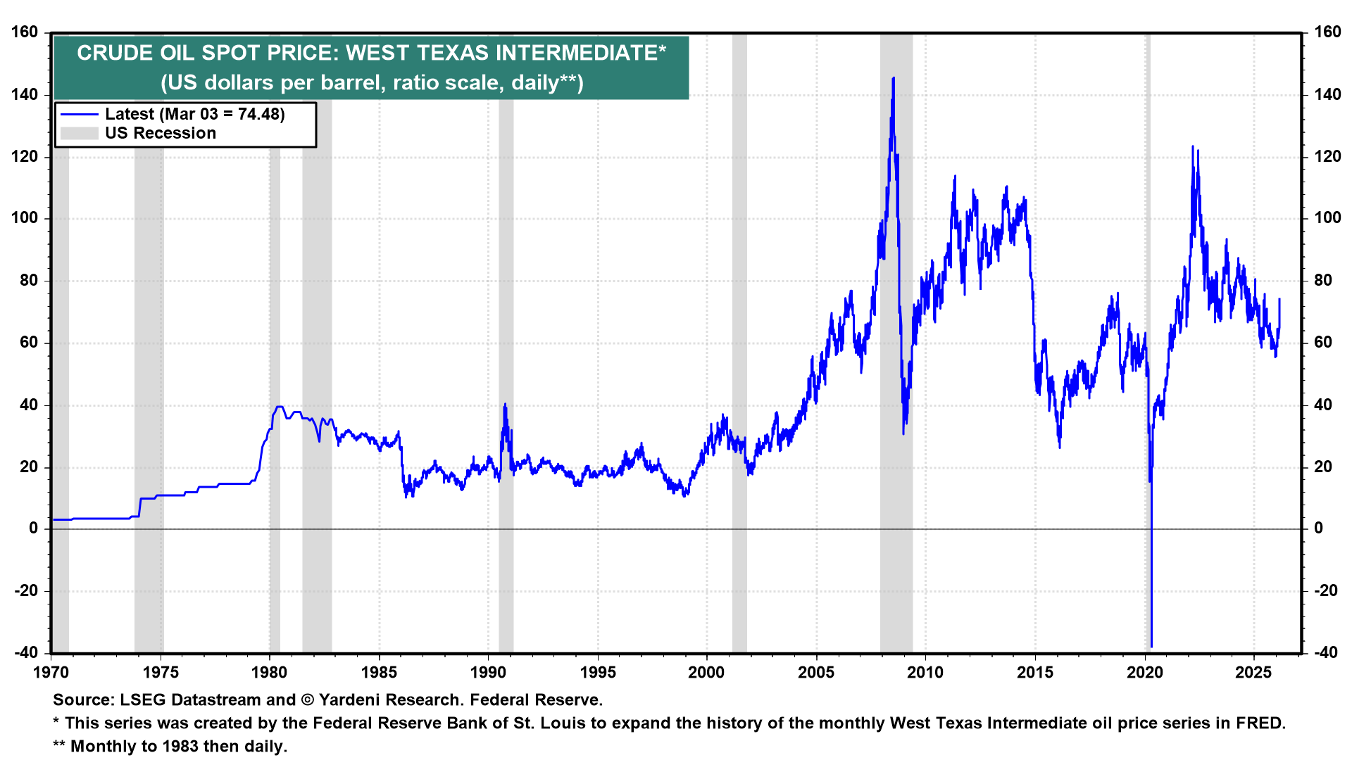 Rapidly rising oil prices have a history of causing recessions and bear markets in stocks (chart). That was not the case in 2022, when oil prices spiked, and the economy continued to grow, yet there was a bear market. The longer the war lasts, the more likely it is that the oil price shock results in stagflation. The Fed would be frozen as the risks of higher inflation and higher unemployment both increase.