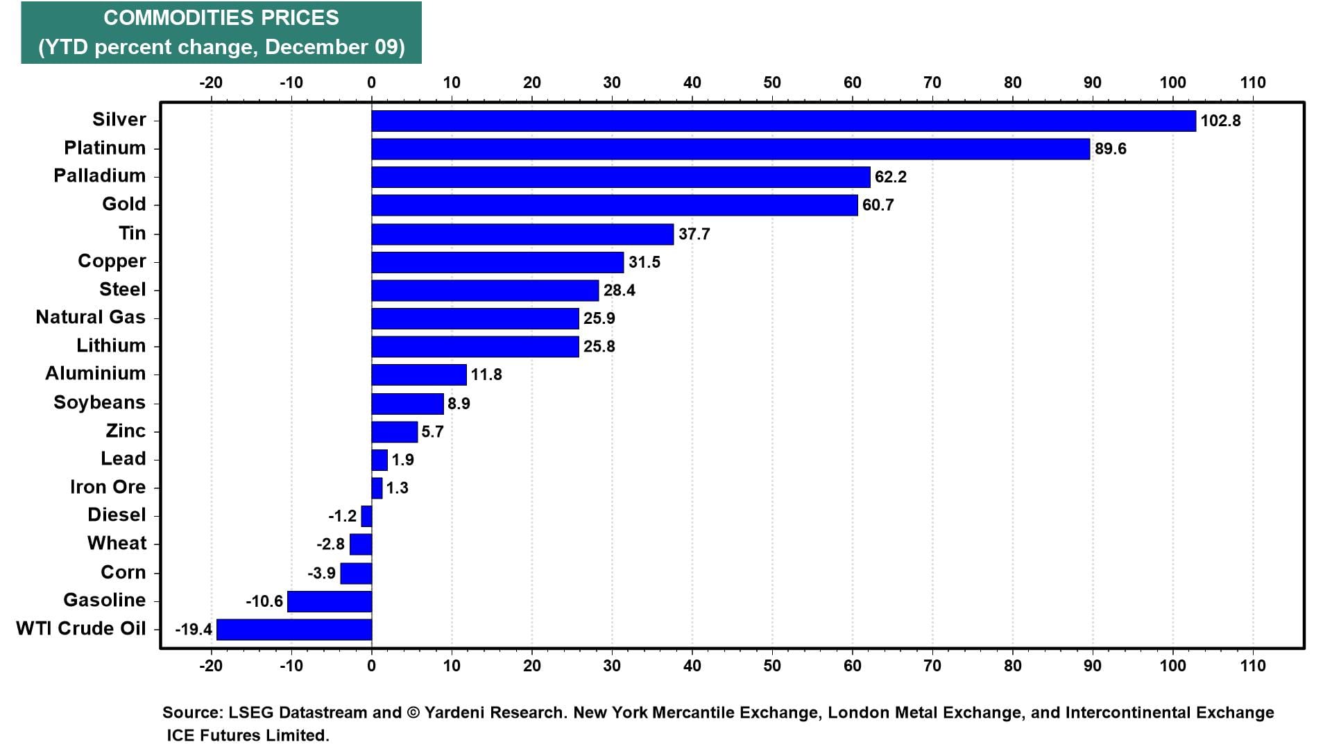 That's a solid increase for Walmart's stock price but chump change compared to the run in silver's price, which is another AI play. Today, silver broke a historical record, surpassing $60 per ounce and doubling in value so far in 2025 (chart). The build-out of AI data centers is intensifying the demand for silver, and so is the ongoing production of EVs (which use more silver than combustion engines).