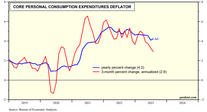 Both the headline and core PCED inflation rates rose 0.2% m/m in July. Fed Chair Jerome Powell anticipated that they would be moderate as they were in June in his Jackson Hole speech on Friday of last week. However, he said that two consecutive months of such moderation aren't enough. He wants to see inflation drop closer to the Fed's 2.0% target on a y/y basis. The headline and core PCED inflation rates were 3.3% and 4.2% on a y/y basis during July. He is focusing on the core rate, which by the way rose at just an annualized 2.9% rate over the past three months (chart).