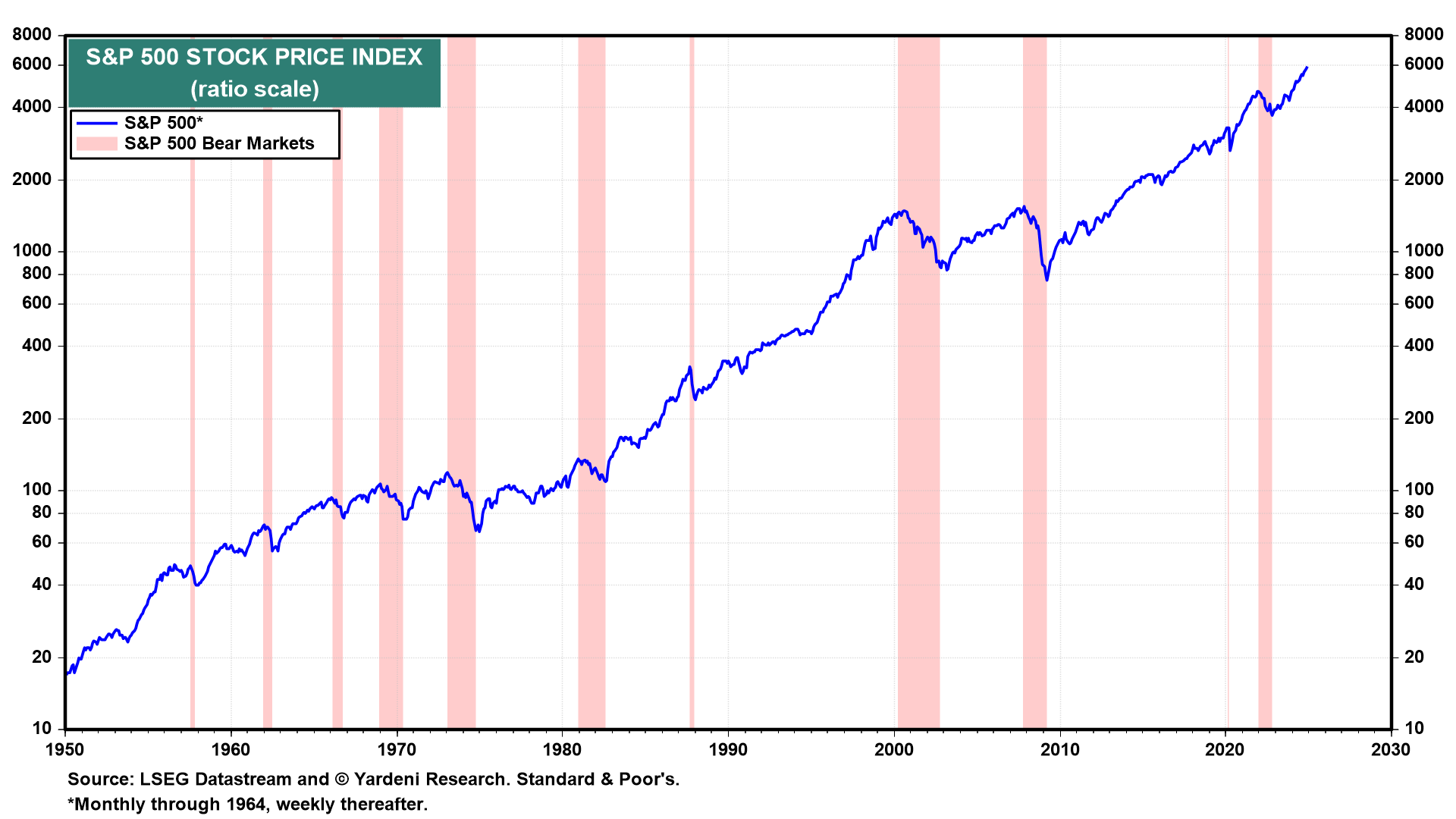 (1) The past half-century has brought only six bear markets. When I started my first job on Wall Street at EF Hutton in January 1978, the S&P 500 price index was at 90 (chart). Today, it is at 6000. That’s a 66.6-fold increase in 47 years. I wish I had been bullish over this entire period and had the funds to invest when I started my career. Over this entire period, there were just six bear markets, and they lasted on average only a bit more than one year.