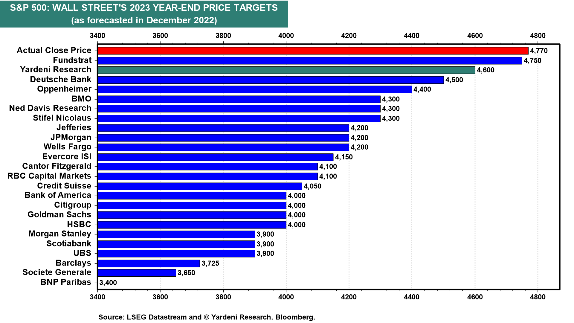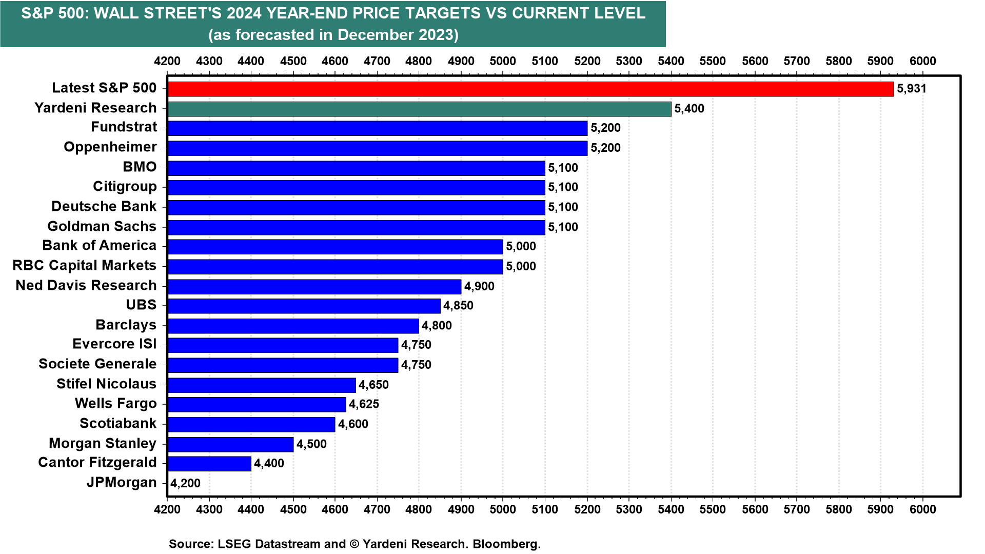 (6) At the start of 2023 and 2024, Fundstrat and Yardeni Research had the highest S&P 500 targets among Wall Street’s major research shops (charts).