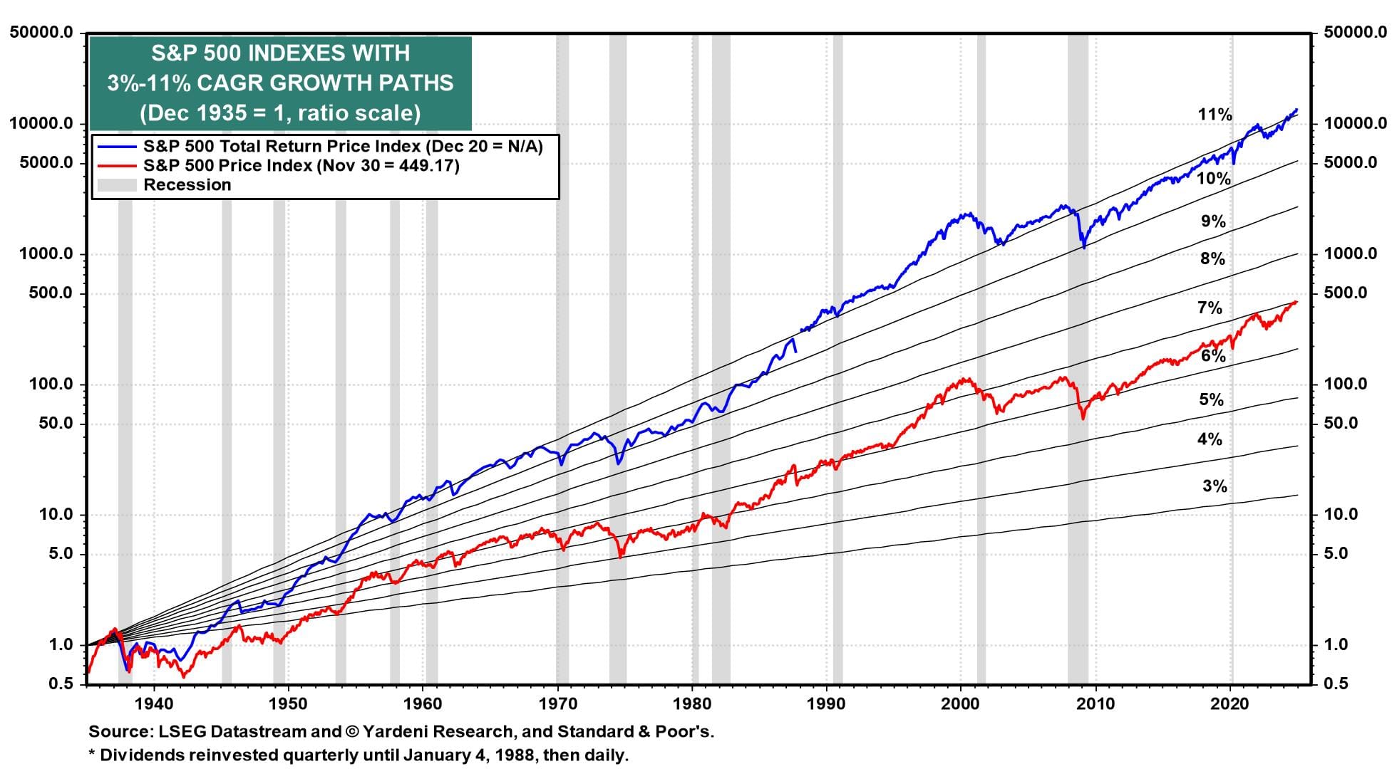 Granted, current valuation multiples are stretched by historical standards; but in 10 years, they might still be as high as they are now even with drops along the way. If so, then over the next 10 years the S&P 500 price index would rise along with its earnings—at a pace that should be at least twice as fast as Goldman’s 3% annual projection and closer to 11% including reinvested dividends (charts). In our Roaring 2020s scenario (and maybe Roaring 2030s), valuations might be higher than they are today.