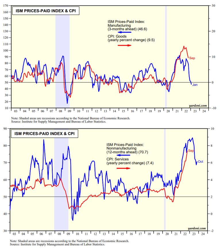 The second version of that adage will still make sense until inflation shows clear signs of moderating. The next important reading on inflation will be October's CPI, which will be released on Thursday, November 10. October's PMIs suggest that inflation should moderate in coming months: