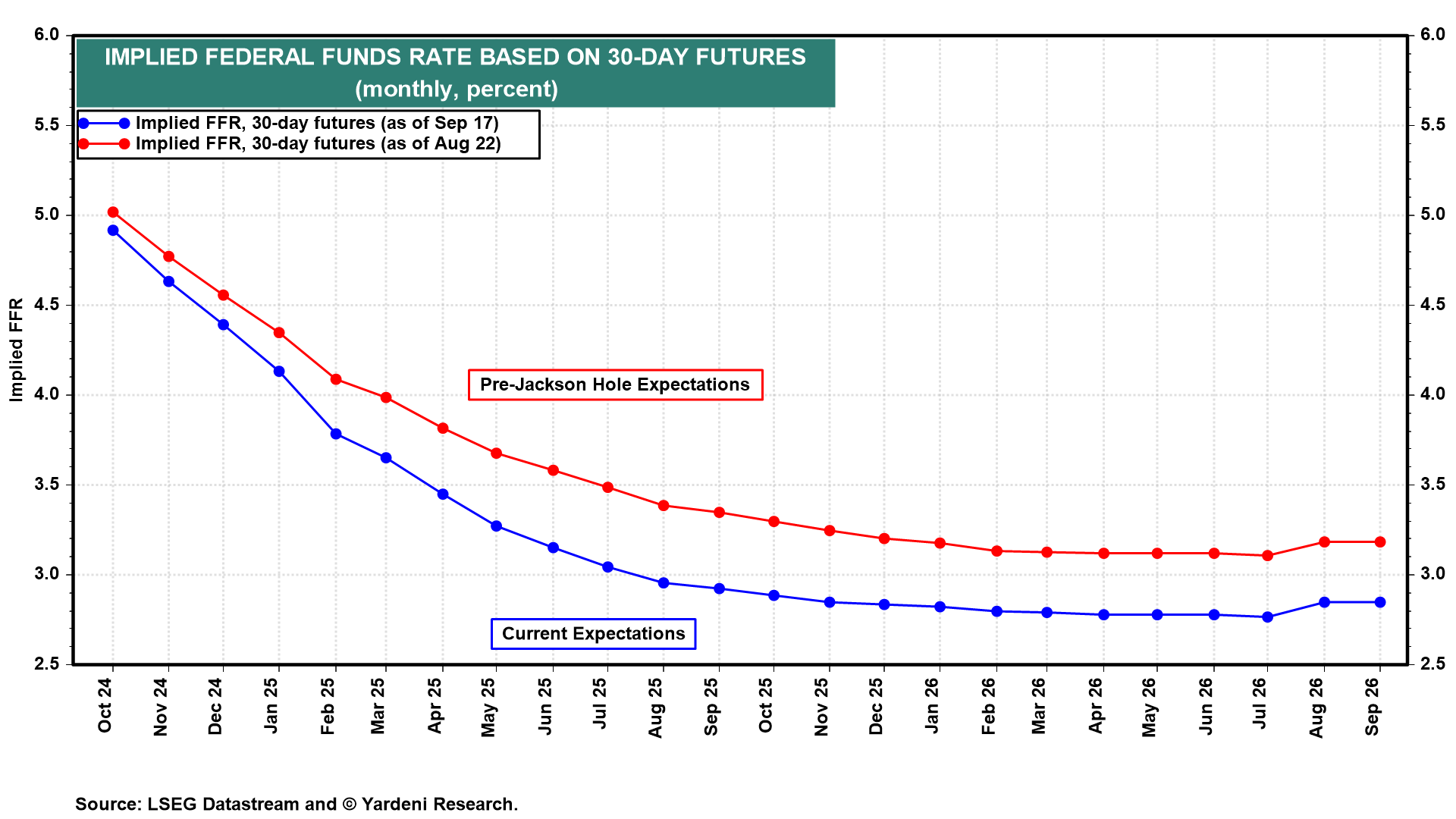 By the way, the FOMC's updated rate forecasts show the FFR falling to 2.9% in 2026. That implies a much slower pace of rate cuts than the FFR futures market, which expects 2.8% in the next 12 months (chart).