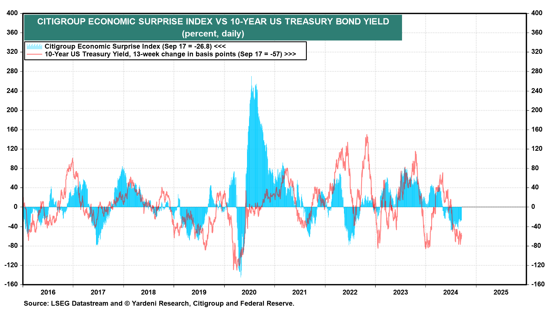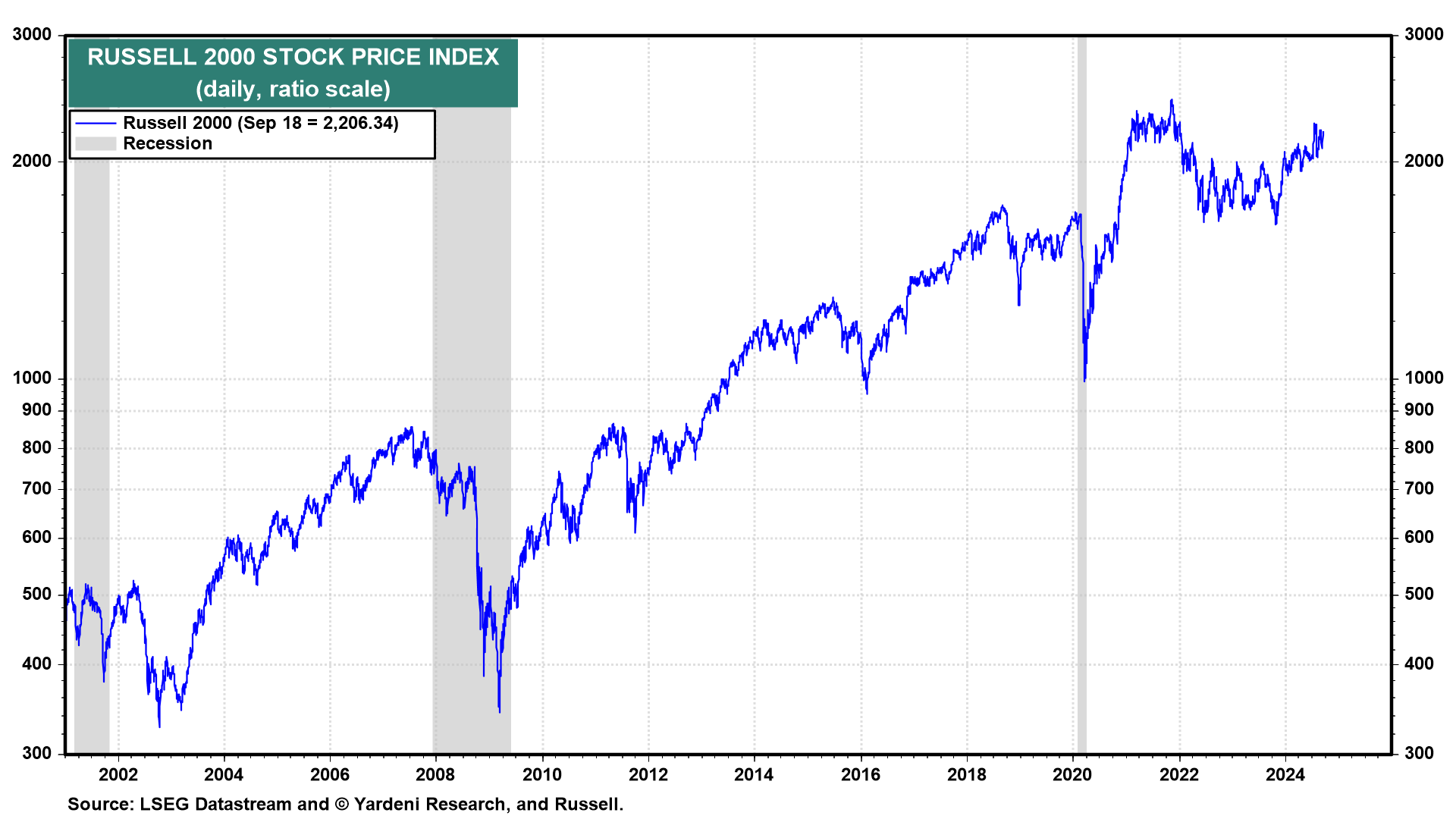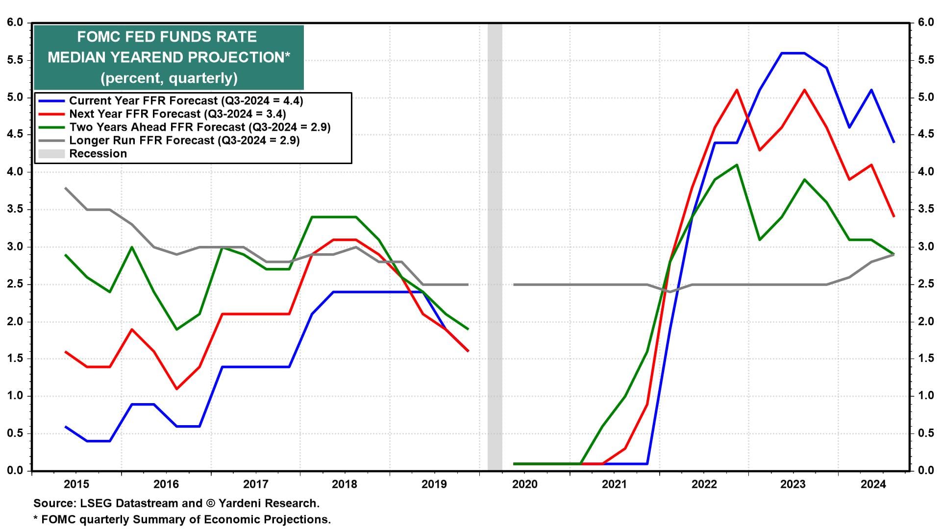 In response to the Fed's statement at 2:00 p.m., the S&P 500 rallied to a new record high of 5674 by 2:30 p.m. when Powell's presser started. As he spoke, however, stocks turned down and closed lower on the day as the 10-year Treasury yield rose above 3.70%. We still expect the stock market to climb to new record highs after the November presidential election. Now that the Fed is stimulating the economy, the hard-landing crowd should disperse.