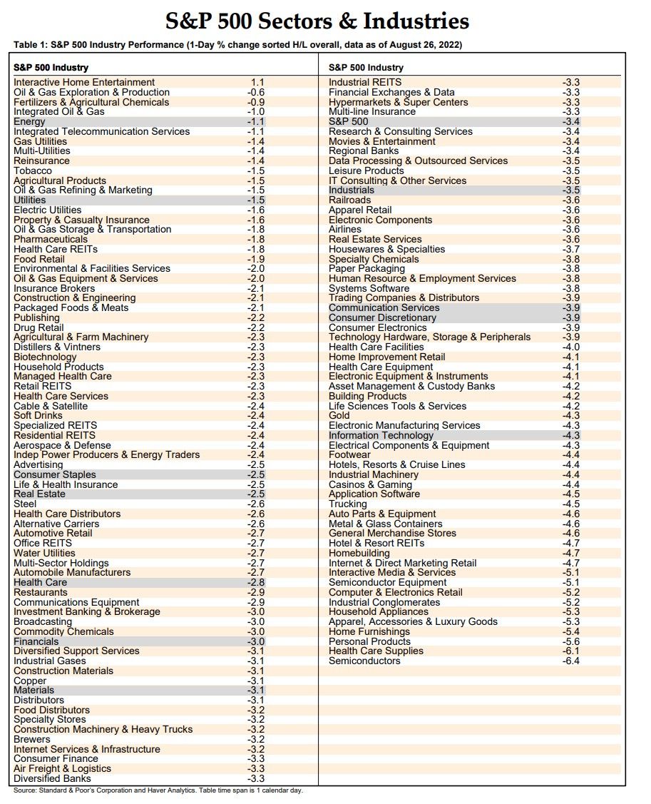 The result on Friday was carnage in the stock market with all 11 sectors of the S&P 500 taking hits on Friday (table below). Only one of the 100+ industries we track was up on the day.