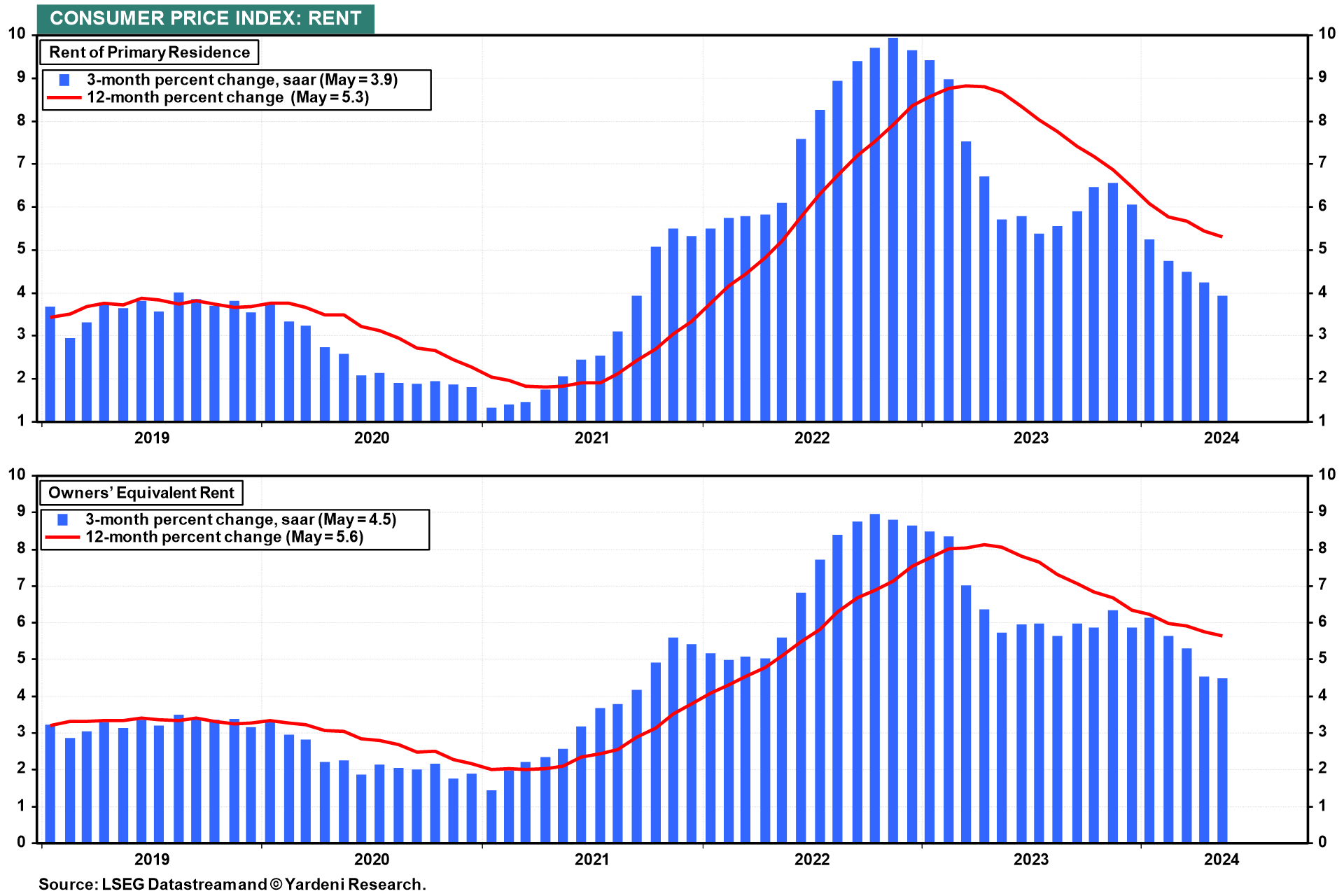 (1) Rent inflation. Rent inflation continued to moderate through May in the CPI (chart). It should do the same in May's PCED report on Friday.