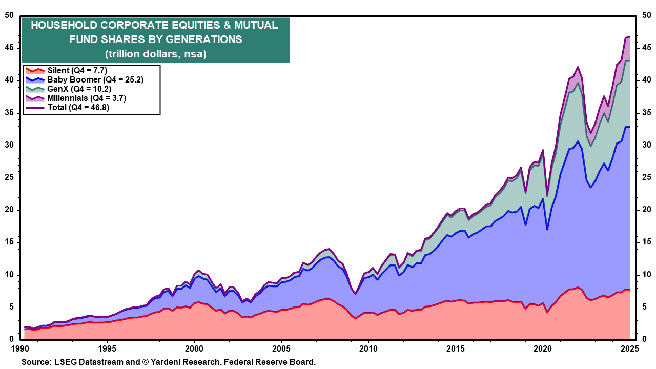 Among our main concerns about Trump's Tariff Turmoil was that the drop in stock prices would have a significant negative wealth effect on consumers, especially retired and soon-to-be retiring Baby Boomers, who collectively own about $25 trillion in corporate equities and mutual funds (chart). We raised our subjective probability of a recession this year from 20% to 35% on March 5, and from 35% to 45% on March 31 as stock prices tanked in response to TTT.