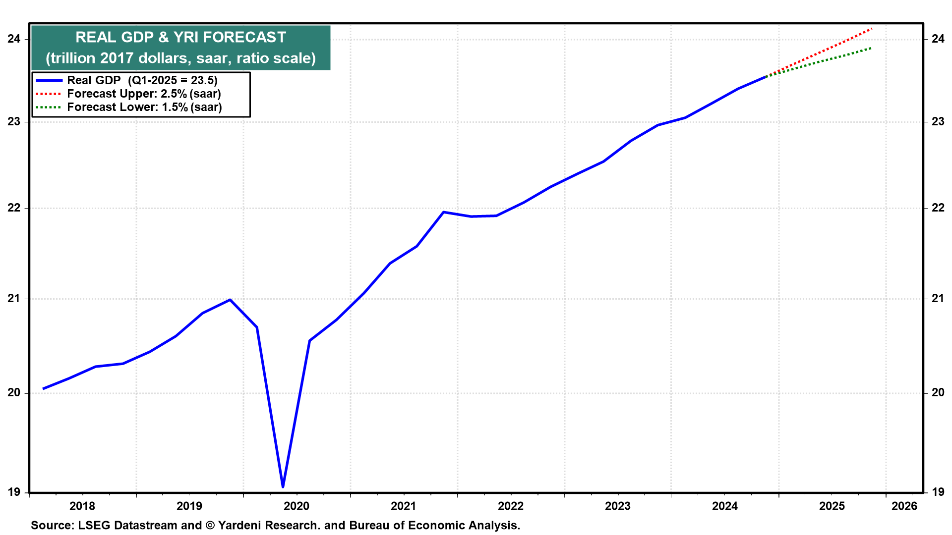 We are still predicting that S&P 500 forward earnings will rise to $300 per share at the end of this year. We now see the S&P 500 forward P/E at 21.6 at the end of the year rather than 20.0 as we previously had projected. We are raising our real GDP growth range to 1.5%-2.5% this year, up from our previous 0.5%-1.5% (chart).