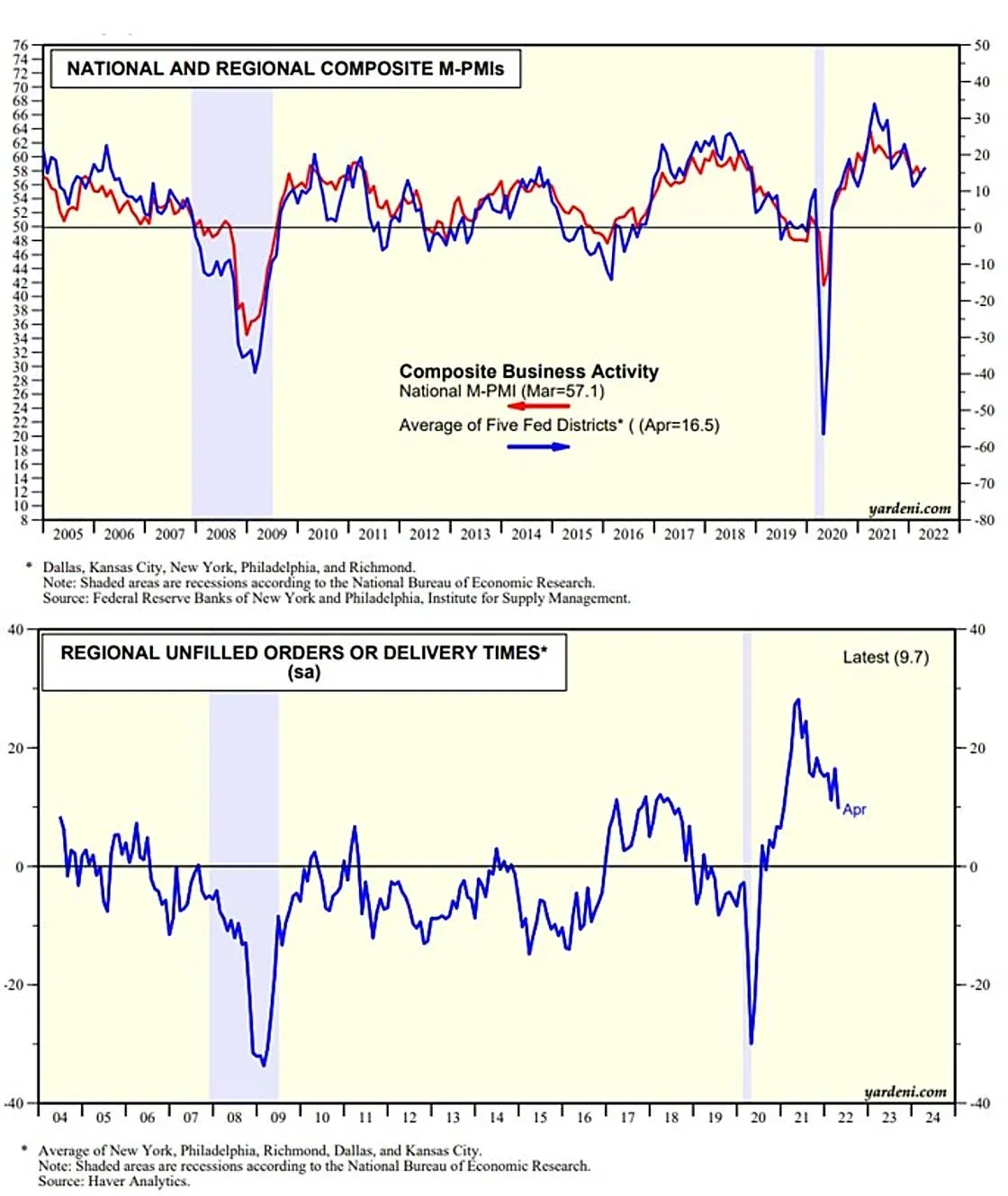 The average of the five regional indexes for unfilled orders and delivery times continued to fall in April, suggesting that supply-chain disruptions are easing. However, the impact of pandemic-related lockdowns in China could soon be a setback to this improvement. The bad news is that the averages of the Fed banks’ prices-paid and prices-received indexes remained elevated around recent record highs.