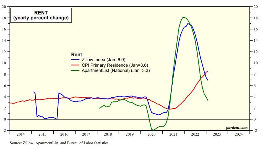 The CPI's rent of primary residence is showing no signs of peaking, rising to 8.6% y/y during January (chart). However, it is widely recognized that this measure is a laggard because it includes rents not only on new leases, but also outstanding ones. The market-based rent inflation indexes compiled by Zillow and ApartmentList have been plunging from around 17% a year ago to 6.9% and 3.3% during January.