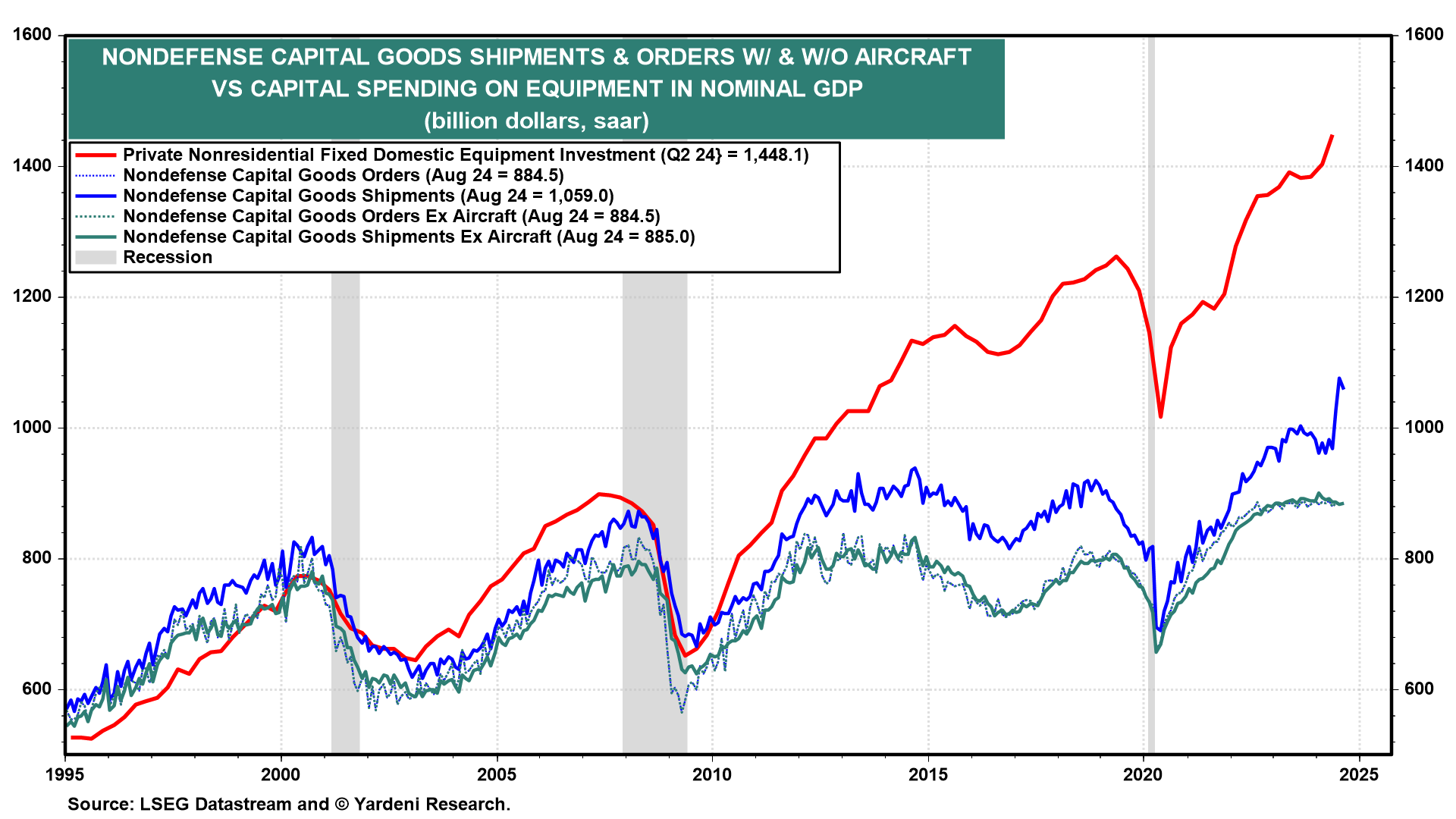 (6) Durable goods. August's shipments of capital goods fell 1.6% m/m, as Boeing's big July faded a bit last month (chart). Nondefense capital goods orders excluding aircraft rose 0.2% m/m after falling in July. In any case, durable goods orders and shipments haven't been a good indicator of equipment investment in GDP for several years.