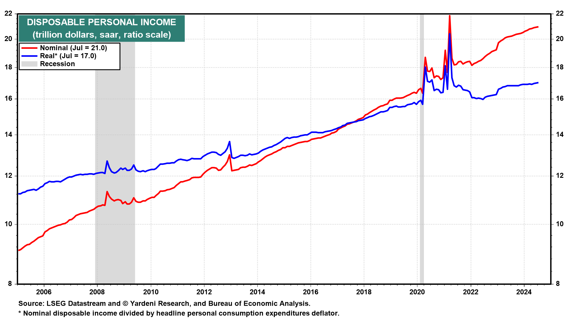 (2) Wages & salaries. Much of the increase in GDI was due to increased worker compensation. Real disposable personal income growth was raised from 1.0% to 2.4% (chart).