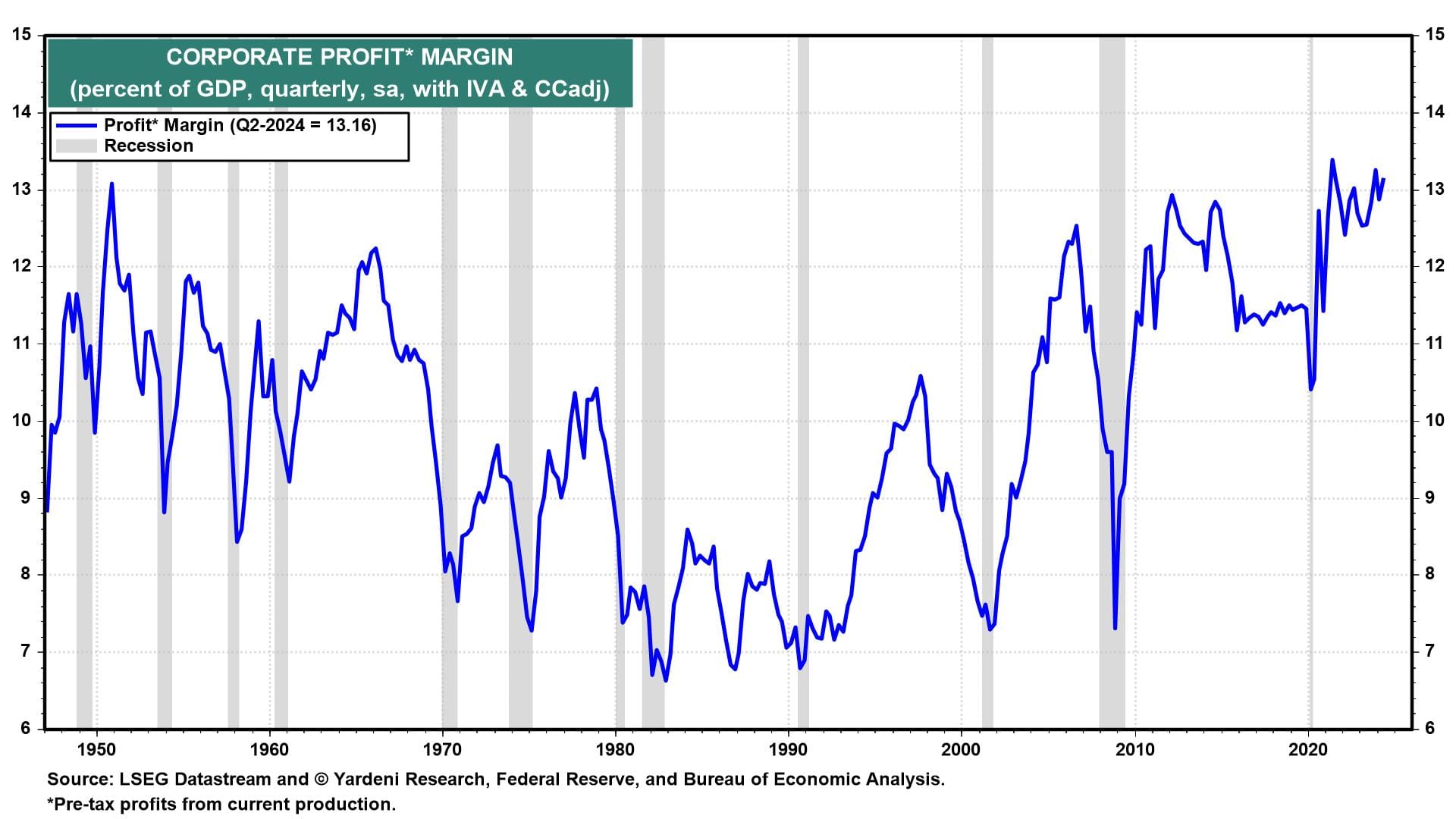 (4) Corporate profits. Corporate profits was also revised higher in Q2. The pre-tax profit margin has now been above 13% for much of the post-pandemic period, only previously seen once in 1950 (chart). We're bullish on productivity growth fueling wider margins in our Roaring 2020s outlook. We also expect strong GDP growth again during the current quarter.