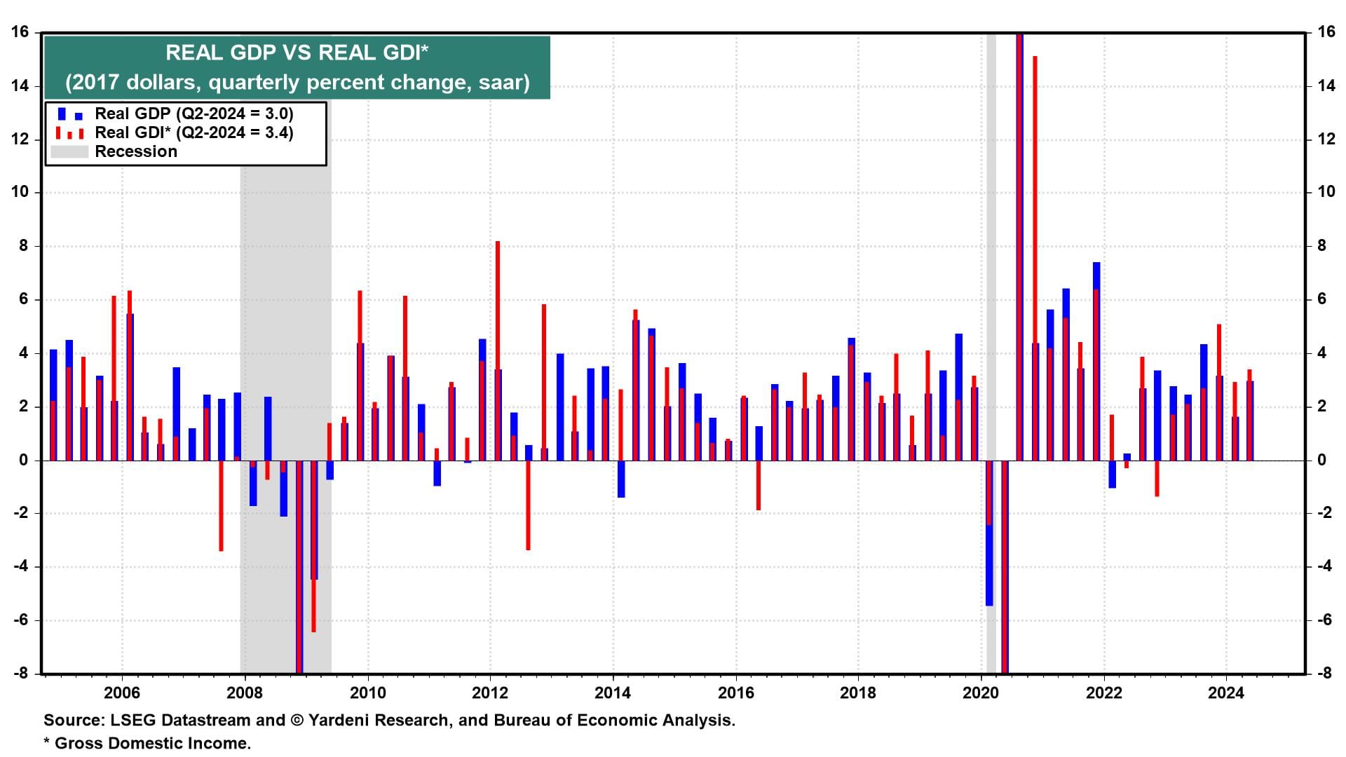 The previous estimate of Q2 real GDP showed it rose 3.0% (saar), while real GDI increased by 1.3%. That created the largest gap between the two since 1993. The BEA's final estimate of Q2 real GDI raised it to 3.4%. GDI was also revised higher in Q1, from 1.3% to 3.0% (chart). Real GDP growth remained at 3.0% during Q2 and was revised up slightly to 1.6% in Q1.