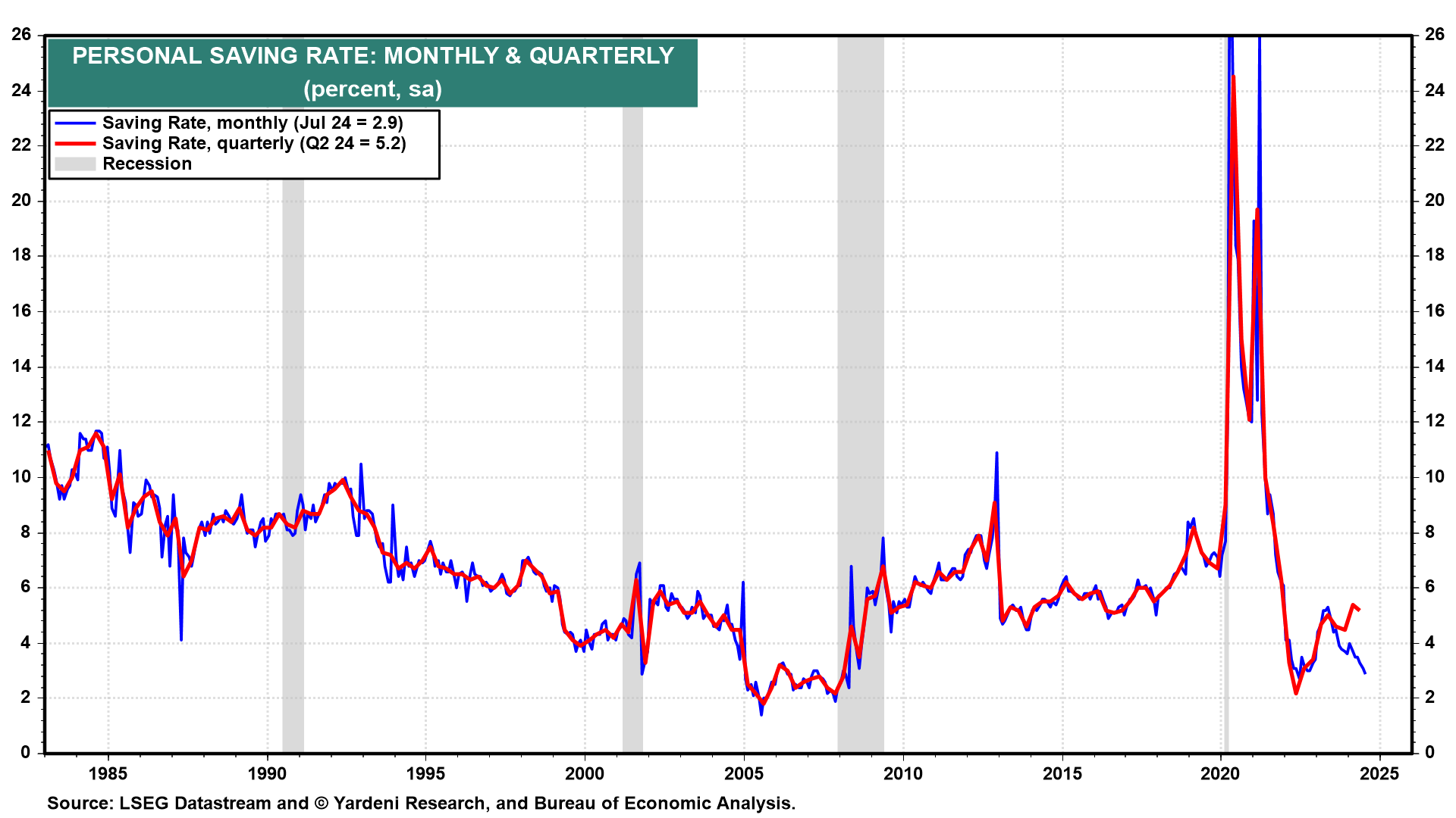 (3) Personal saving rate. The upward revision in personal income during H1-2024 resulted in significant upward revisions in the personal saving rate during the first two quarters of this year (chart). The monthly data will be revised upwards in tomorrow's personal income release.