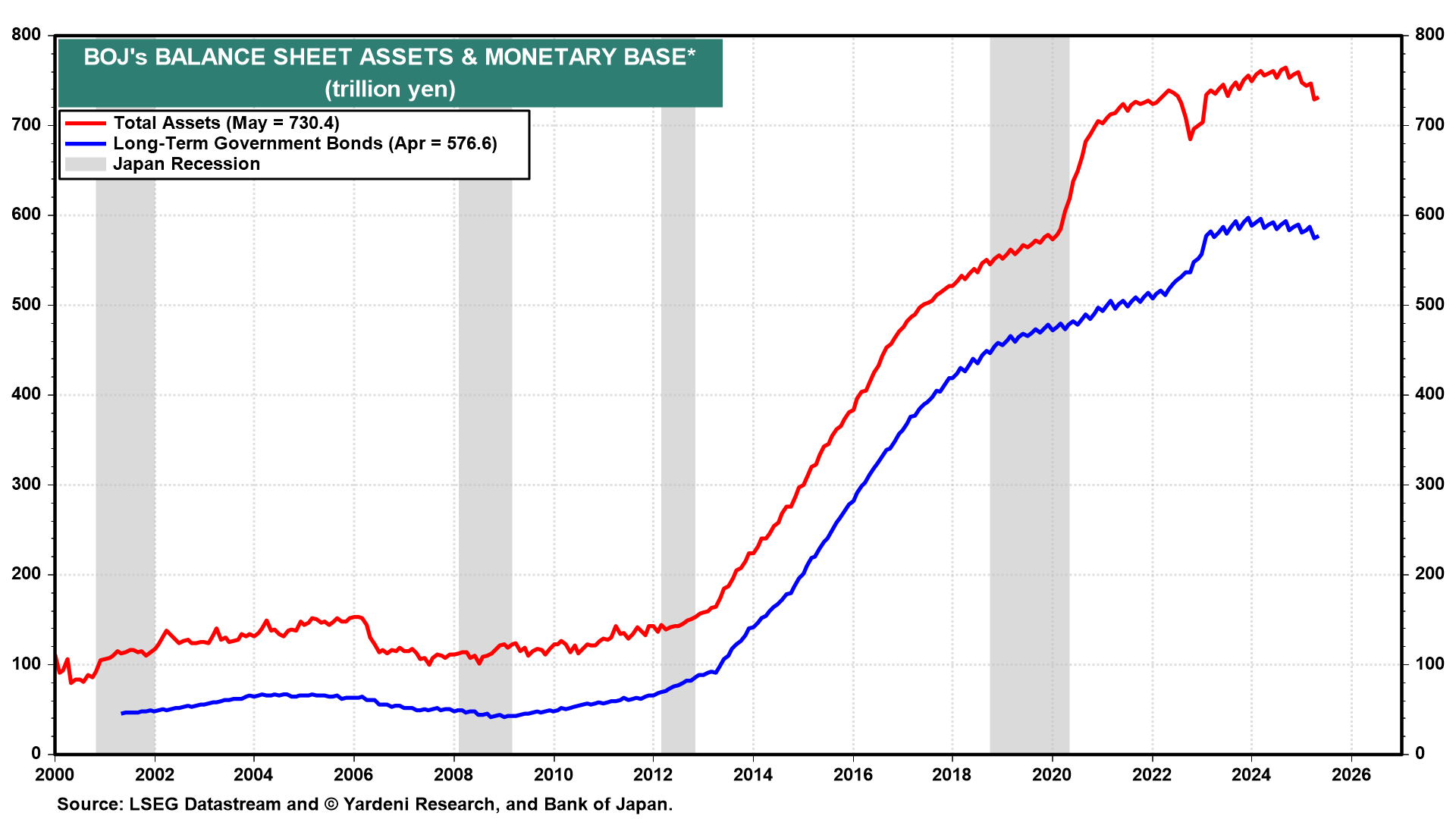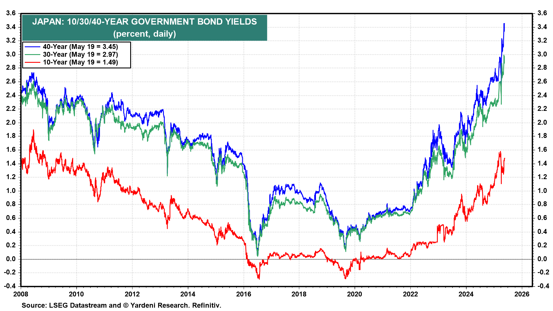 (1) Japan. While pessimists have been predicting an imminent sovereign debt crisis in the US, it seems to be unfolding in Japan currently. Amid a shrinking economy and growing mountain of debt, Prime Minister Shigeru Ishiba issued a harsh warning this week, "Our country's fiscal situation is undoubtedly extremely poor," adding, "worse than Greece's.” Japan's GDP shrank in Q1; and on Monday, the cost of borrowing increased after yields on its 40-year government bond reached highs last seen about 20 years ago (chart). The slump in Japanese bonds worsened today after the weakest demand at a government debt auction in more than a decade. The bid-to-cover ratio at Tuesday’s 20-year bond sale fell to the lowest since August 2012.