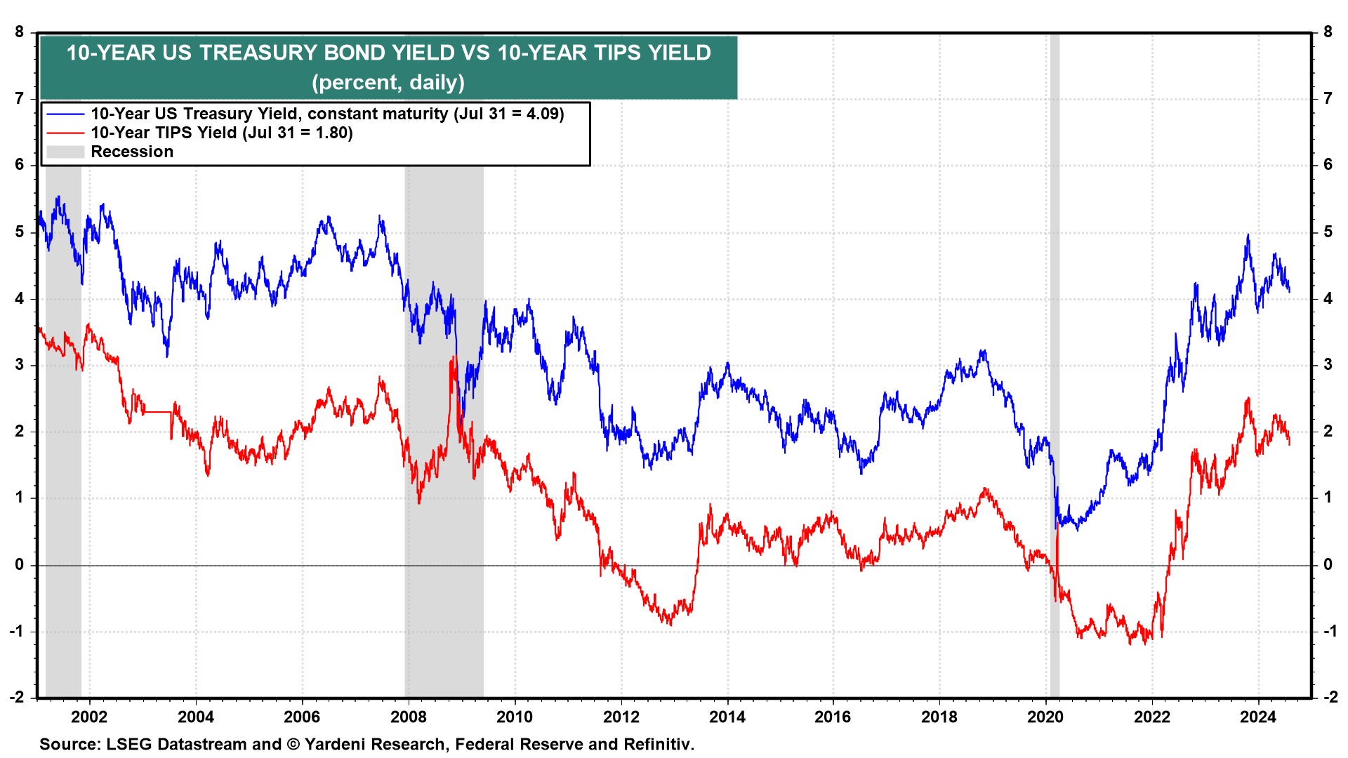 In any event, bond investors are certainly enjoying themselves; the 10-year yield fell 12 basis points to 3.98% and is now down more than 60bps in the past 3 months. The 10-year TIPS yield slid below 1.8% to its lowest since February (chart).