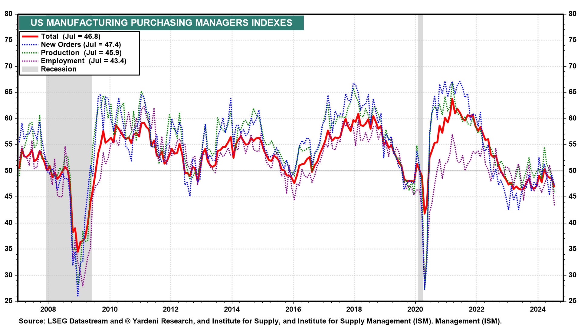 (2) Manufacturing. July's ISM national M-PMI fell to 46.8 from 48.5. The index has generally been below 50.0 for the past two years; the eye-catcher was the employment index, which fell 5.9 pts to 43.4, consistent with lows seen during the pandemic and Great Financial Crisis (chart). Of course, the M-PMI has been accurately signaling the ongoing growth recession in the manufacturing sector, not an economy-wide recession.