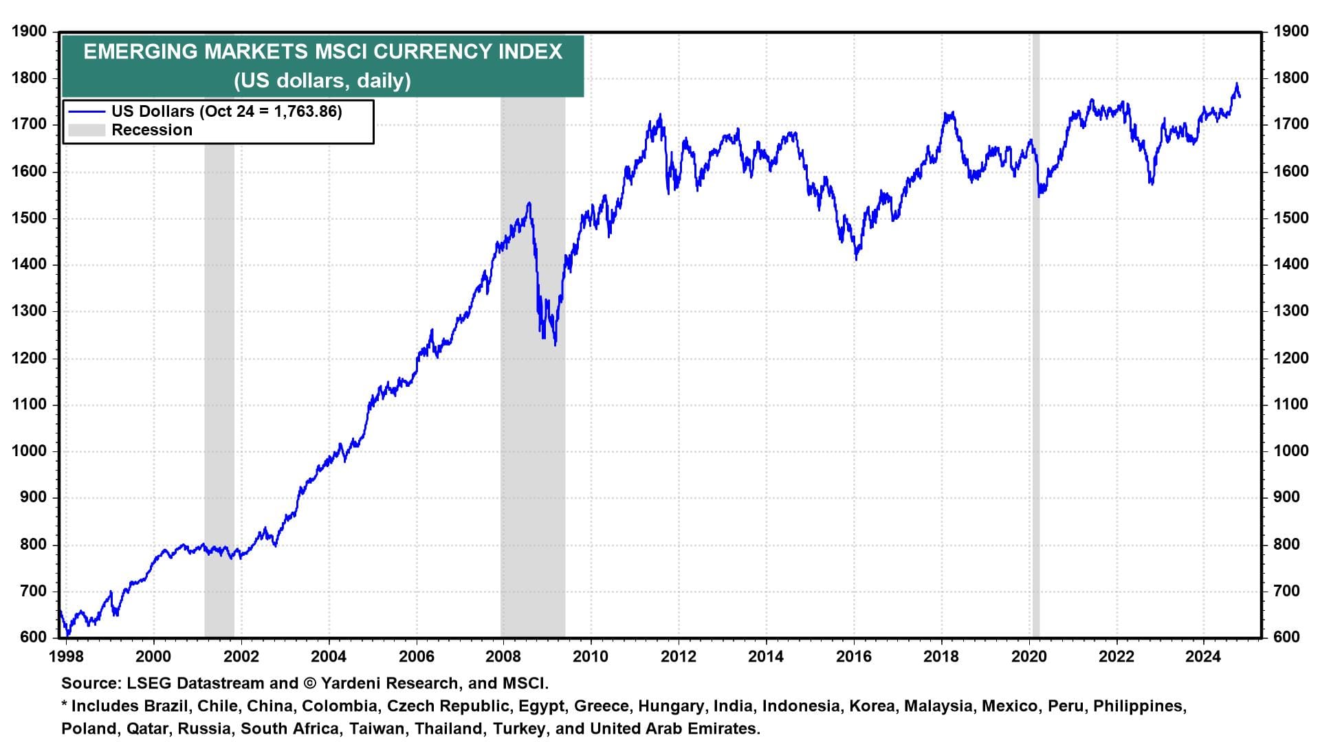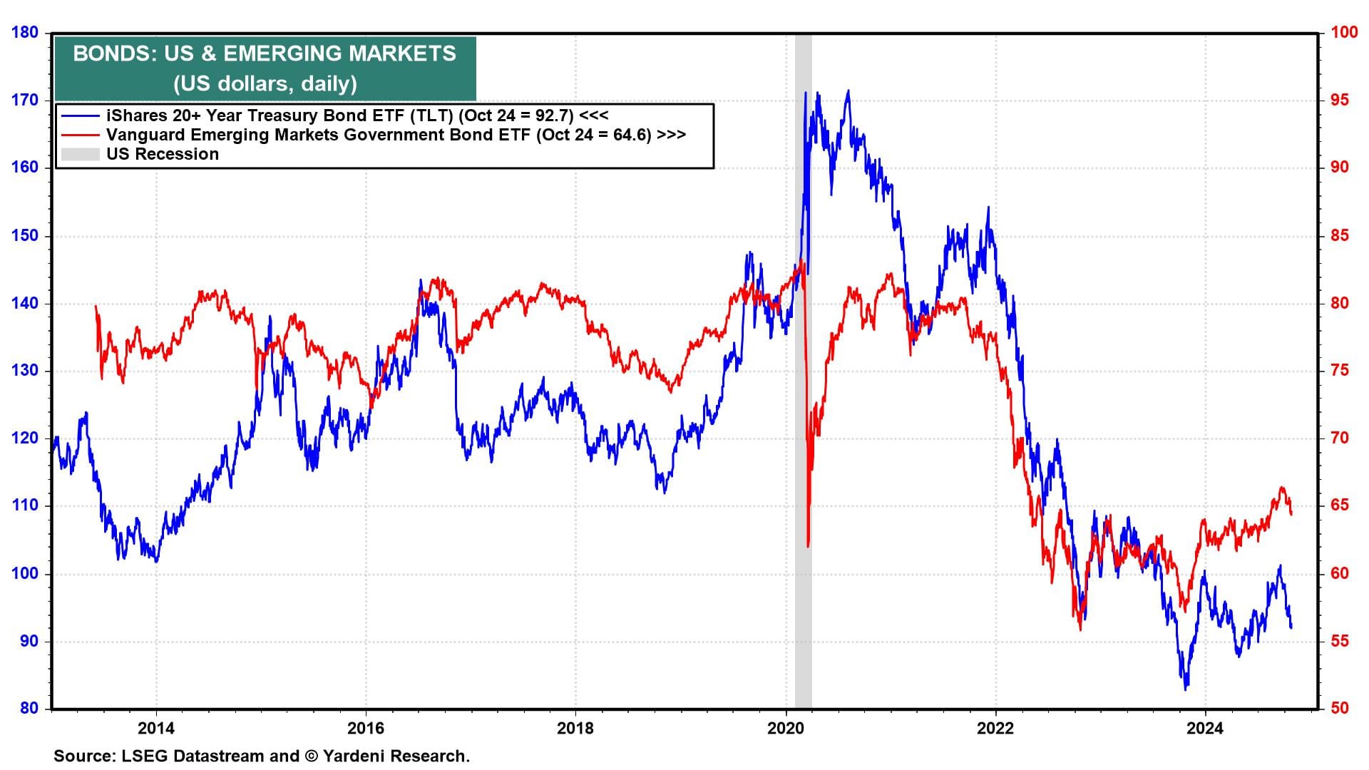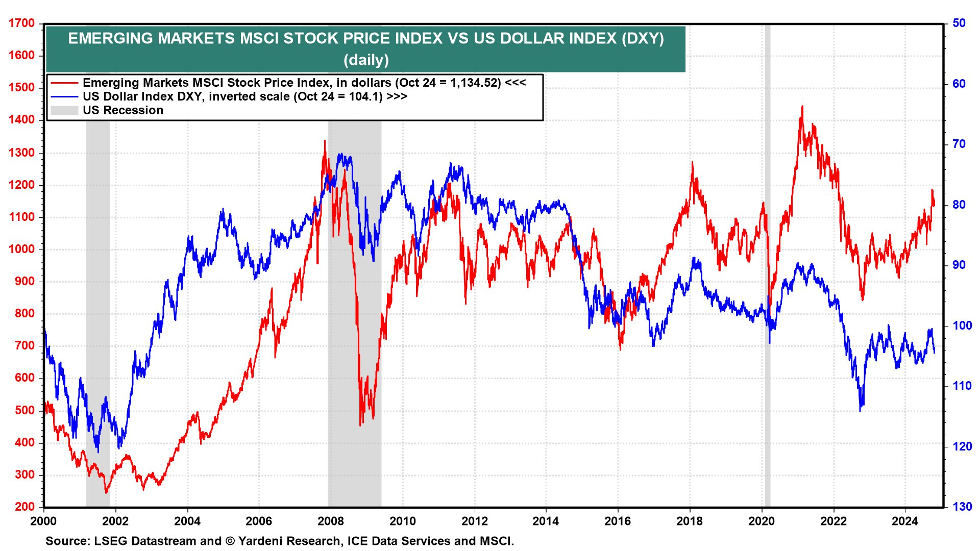 (1) Dollar versus EME currencies and bond prices. As expectations for more Fed rate cuts have faded, the US dollar has strengthened. A stronger dollar raises the cost of imports, risks capital outflows, and weighs on dollar-denominated debts for EMs. While EME currencies have slipped against the dollar in the past few weeks, they're still stronger than at any time in history (chart).