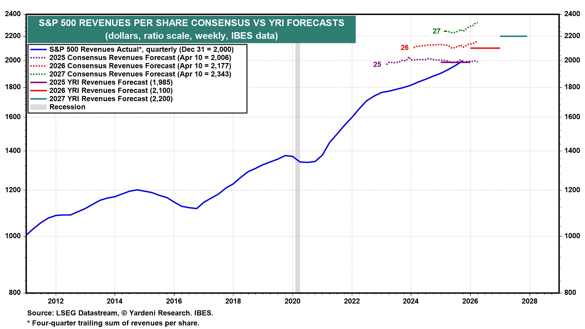 (1) RPS. The analysts' consensus estimates for 2026 and 2027 revenues per share (RPS) are very optimistic, with gains of 8.5% and 7.6% projected (chart). The average annual growth rate of RPS since 1993 is 4.3%, though that includes expansions and recessions.