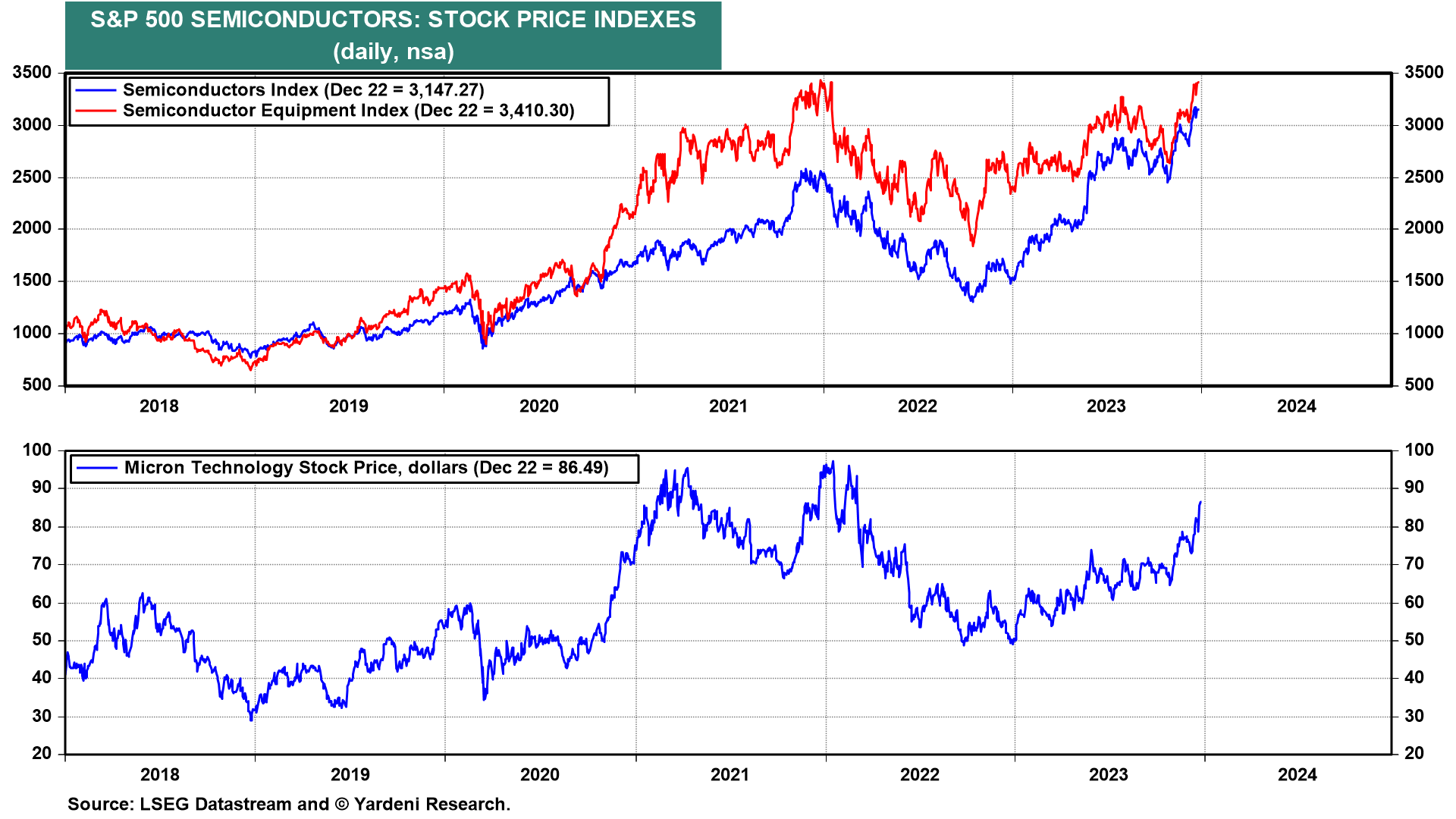 The stock market came roaring back today led by the stock prices of companies that are benefitting from the Roaring 2020s. Strong results and guidance from Micron Technology boosted shares 9% today, while lifting other chip and semiconductor equipment stocks (chart). Micron is the largest US memory chip maker. Its chips go into a wide range of products.