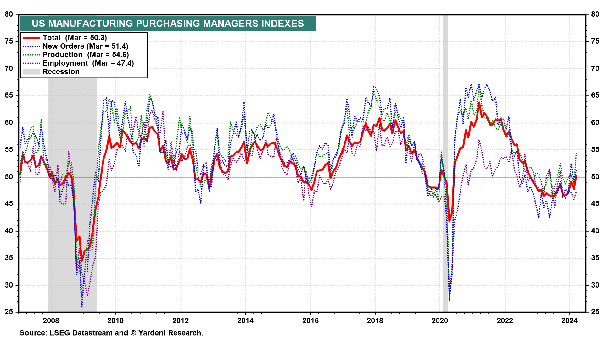 The rolling recessions in manufacturing and retailing are turning into rolling recoveries. That's our conclusion based on today's relatively solid manufacturing purchasing managers report for March. The M-PMI rose to 50.3, the first reading above 50.0 since September 2022 (chart). That was the beginning of the rolling recession that hit goods producers following the post-lockdown goods buying binge that started May 2020. The new orders (51.4) and production (54.6) components of the M-PMI were especially strong. Weighing it down was the employment component (47.4).