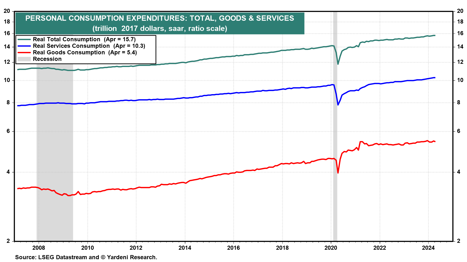 A growth recession is still rolling through the goods sector. Real consumer spending on goods has been flat at a record high since early 2022. We expect that spending on services, technology, and onshoring will keep the economy growing. There's still no stagflation or recession in our forecast.
