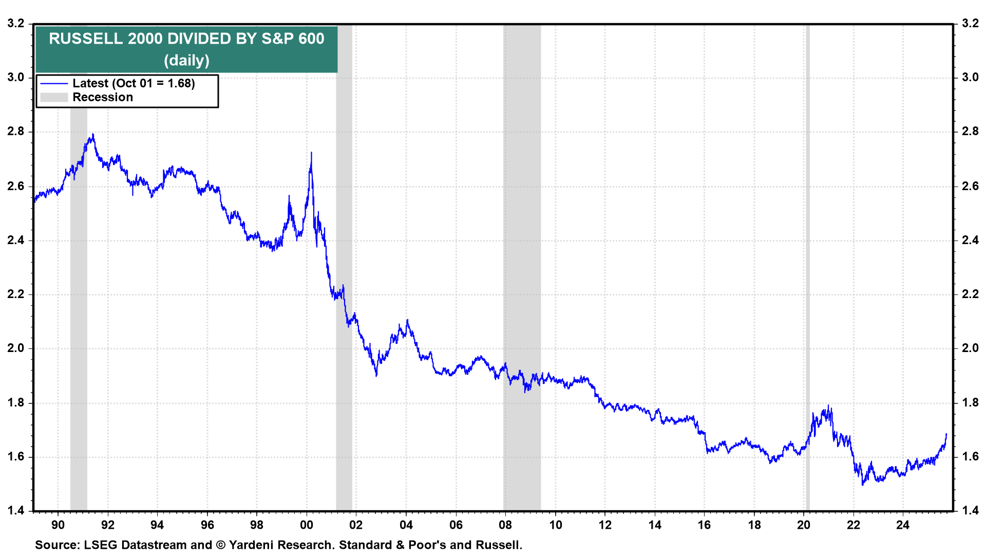 The Russell 2000 small-cap stock price index is outperforming the S&P 600, another small-cap index (chart). The former includes many more companies that are losing money than the latter. This is yet another sign of mounting speculative froth in financial markets in response to the Fed's 25bps cut in the federal funds rate on September 17.