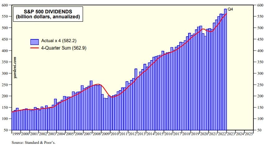Dividends are like plants. Both grow. But dividends can grow forever, while the size of plants is limited. Notwithstanding last year's bear market, S&P 500 dividends grew to a record high of $562.9 billion during 2022 (chart). Dividends tend to fall during recessions along with profits. There was no recession last year. There may not be one this year.