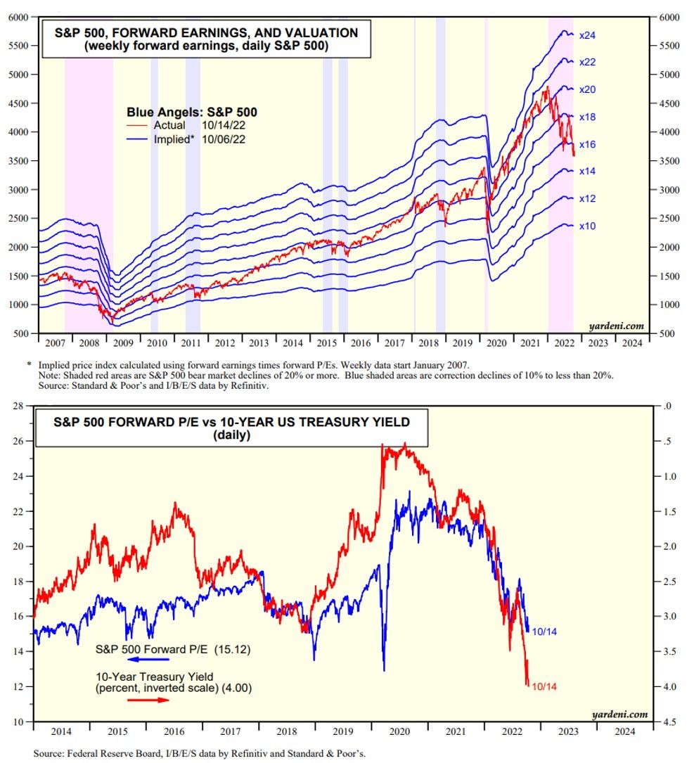 Our Blue Angels framework (chart below) shows that S&P 500 forward earnings have been relatively flat since it peaked in late June. The forward P/E is back down to 15.1, matching the June 16 low. In recent years, this measure of valuation has been highly inversely correlated with the 10-year US Treasury bond yield, which rose to 4.00% today (chart below).
