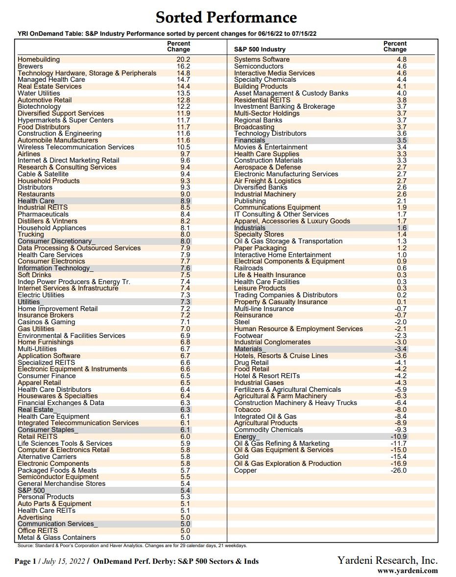 (2) From a fundamental perspective, the reversal of fortune has been led by sectors that benefit from the fall in the bond yield from 3.48% on June 14 (two days before the market's recent bottom) to 2.92% on Friday. The laggards and outright losers since June 16 have been some of the sectors that will be harder hit than the others in a recession scenario, which is gaining credibility as the yield has fallen along with commodity prices. Yet, among the winners are Consumer Discretionary and Information Technology, which would be hurt by a recession.