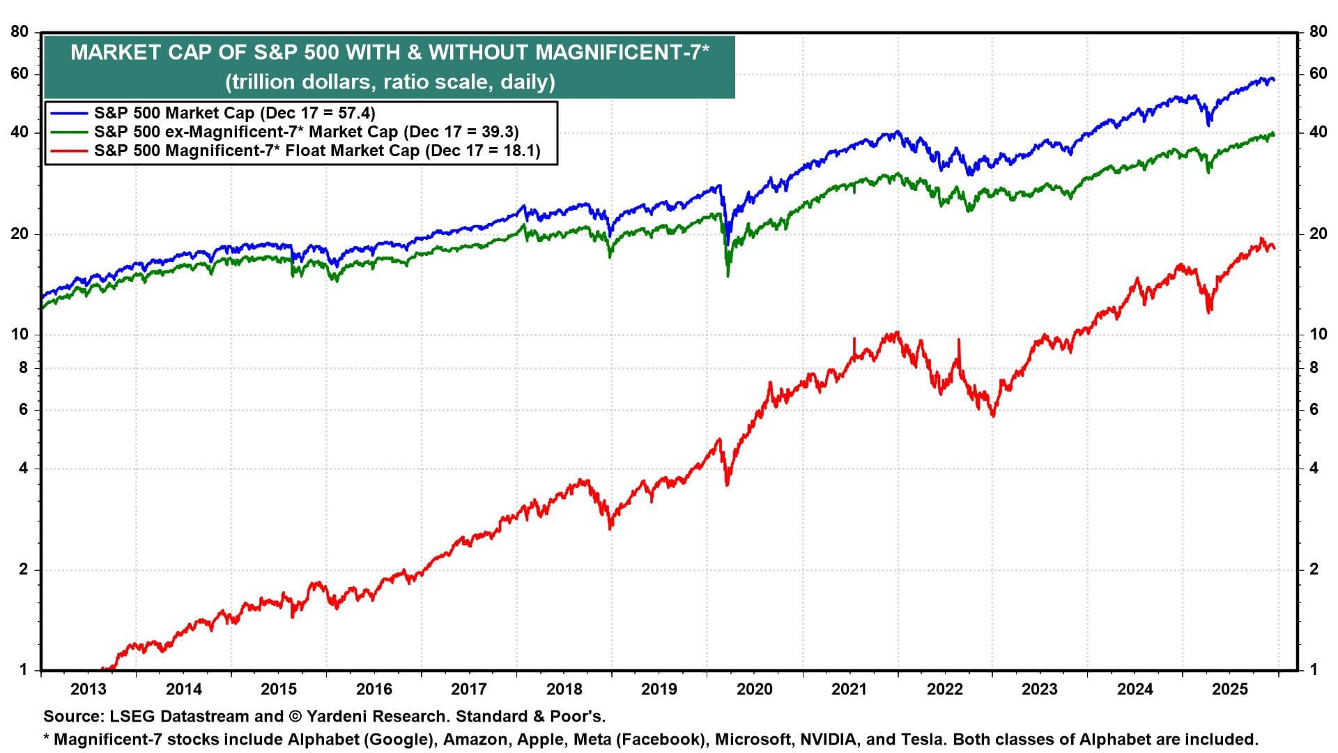 The Mag-7 market capitalization has doubled over the past two years from $10 trillion to $20 trillion (chart).