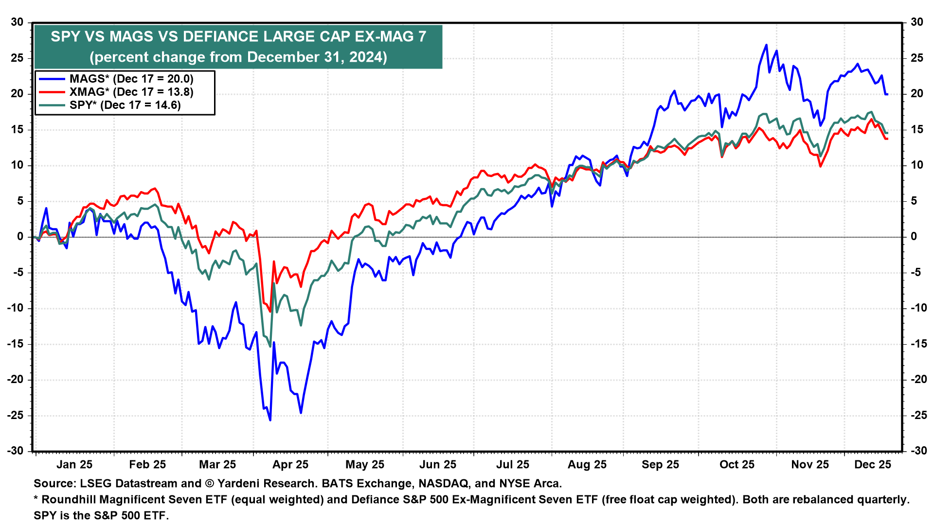 We are declaring "Mission Accomplished" on our 7000-year-end target for the S&P 500. The index rose to a record high of 6901 on December 11. That's close enough for us and might be the high for this year. We aren't ruling out a Santa Claus rally over the remainder of the year. However, that is unlikely to happen if the S&P 500 continues to rotate away from the Magnificent-7 toward the Impressive-493, as we expect (chart). We also expect that this rotation will continue into 2026.