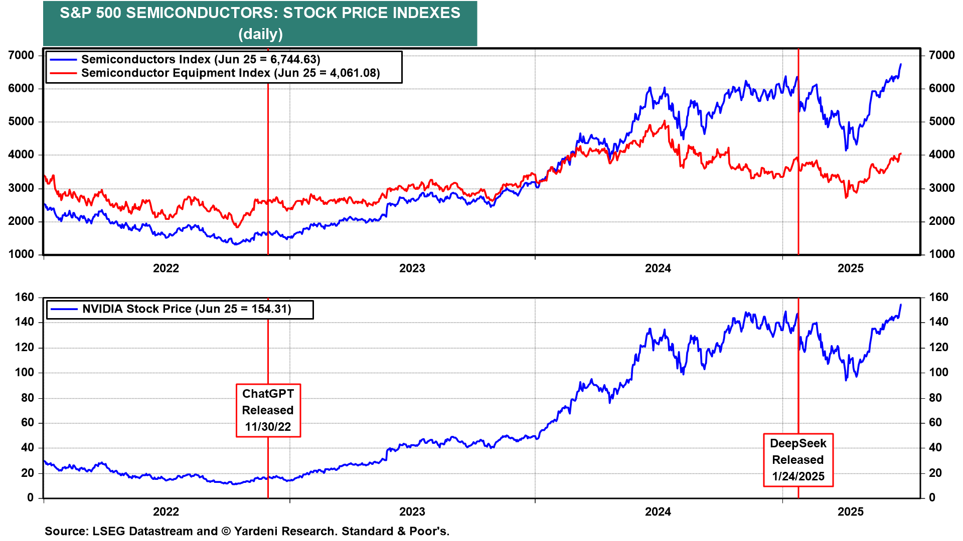 Since the start of the current bull market during October 2022, we recommended overweighting the S&P 500 Information Technology sector and have been especially positive on the S&P 500 Semiconductor industry. We stuck with that recommendation during the correction in the S&P 500 from February 19 through April 8. In recent days, the industry's stock price index rose to new record highs (chart).