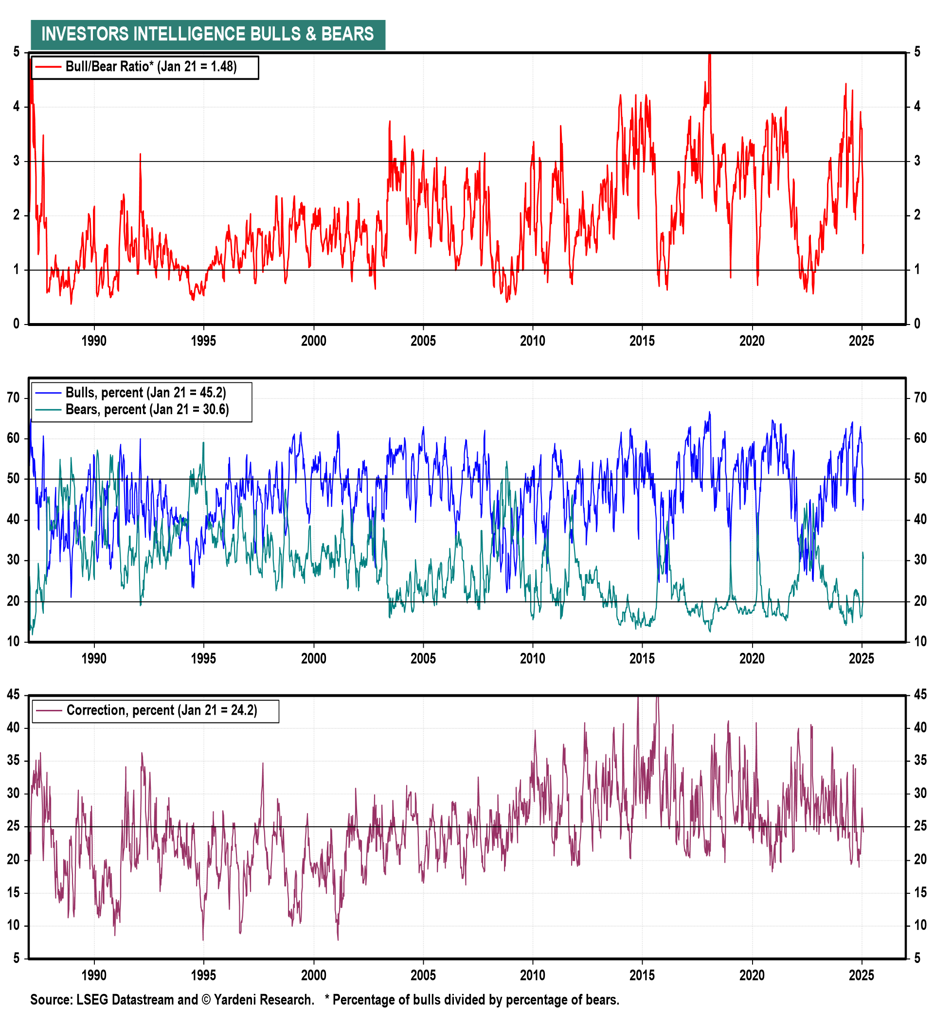 (2) AAII sentiment survey. In the AAI survey (as of January 16), bullish sentiment about the short-term outlook for stocks fell, while bearish and neutral sentiment rose (chart). Bullish sentiment sank 9.2ppts to 25.4%, the lowest percentage since November 2023 (24.3%) and below the measure’s historical average of 37.5% for the third time in seven weeks. Meanwhile, bearish sentiment climbed 3.2ppts to 40.6%, an unusually high reading and above its historical average of 31.0% for the eighth time in nine weeks, while neutral sentiment climbed 6.0ppts to 34.0%—above its historical average of 31.5% for the first time in 12 weeks.