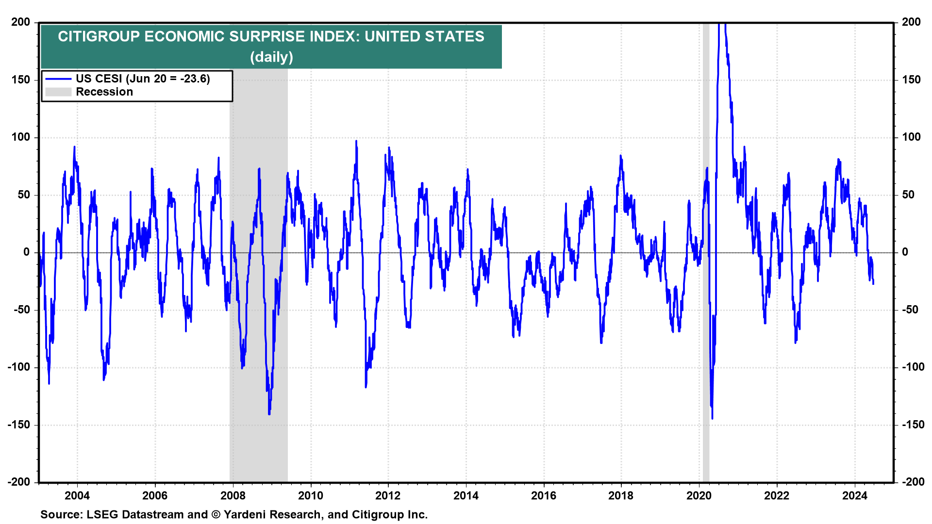 Today's batch of economic indicators was on the weak side. Indeed, the Citigroup Economic Surprise Index fell deeper into negative territory today (chart). Does this suggest that the odds of a recession are increasing? Nope: The Atlanta Fed's GDPNow tracking model is now projecting 3.0% real growth in Q2, down from 3.1% on June 18.