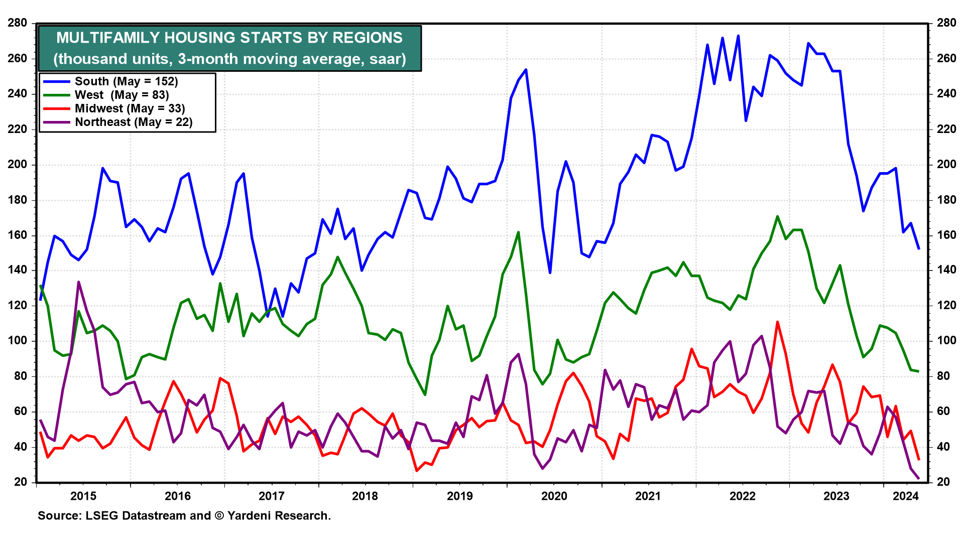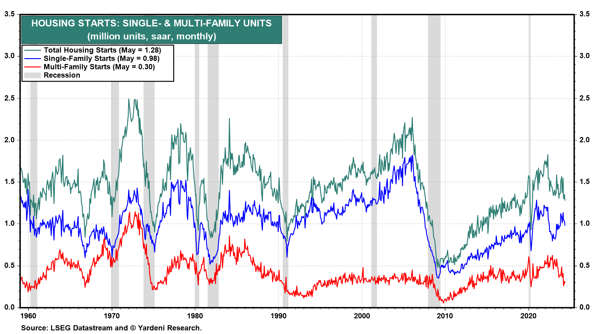 (1) Housing starts & permits. Recent housing starts reports including May's released today showed that the rolling recession in housing has spread to the construction of multi-family units. Over the past 12 months through May, total, single-family, and multi-family housing starts are down 19.3%, 1.7%, and 49.5% (chart).