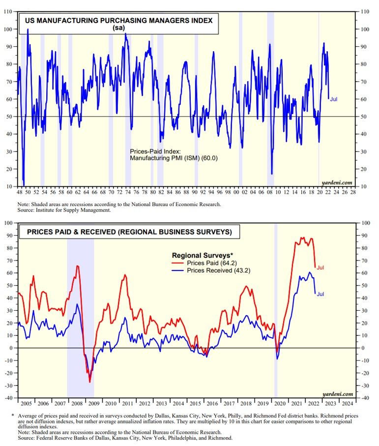 Today was a good day for those of us expecting to see peak inflation soon. July's US manufacturing purchasing managers (M-PMI) survey found that the M-PMI prices-paid index dropped to 60.0 from 87.1 in January. That's not surprising since the prices-paid and prices-received indexes that we compile from the five regional business surveys confirmed that inflationary pressures may be abating (charts below).