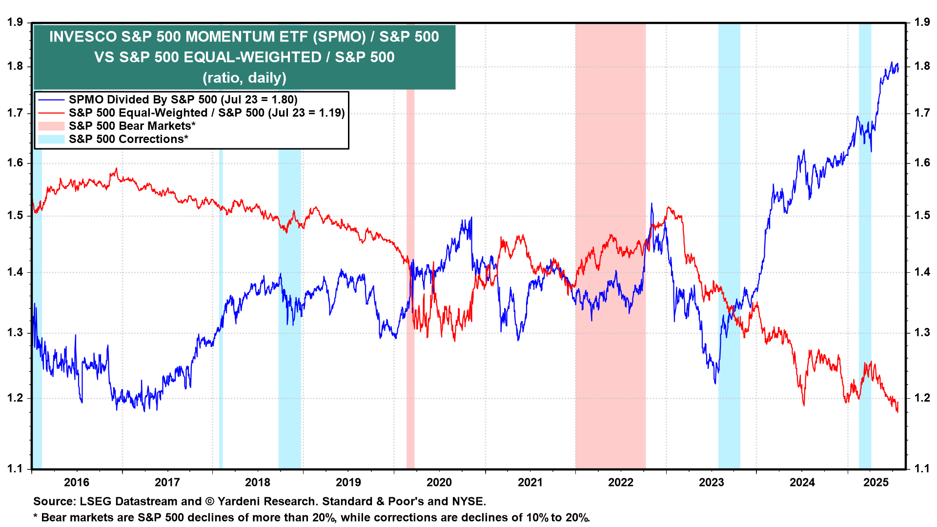 Leading the S&P 500 higher since mid-2023 have been momentum stocks (chart).