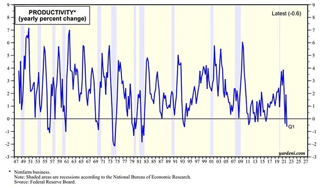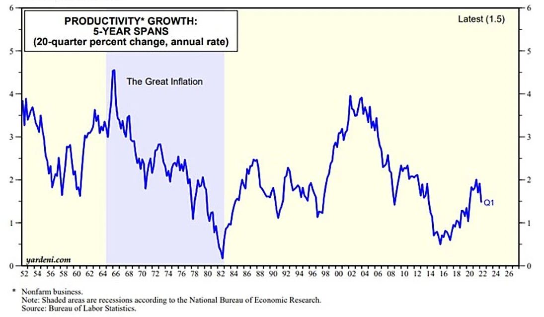 It was a setback for our Roaring 2020s scenario of a technology-led productivity growth boom offsetting the chronic shortage of labor. However, the 20-quarter growth rate was 1.5% at an annual rate during Q1, well above the 0.5% trough at the end of 2015. We still think it is heading to 3.5%-4.5% by the second half of the decade.