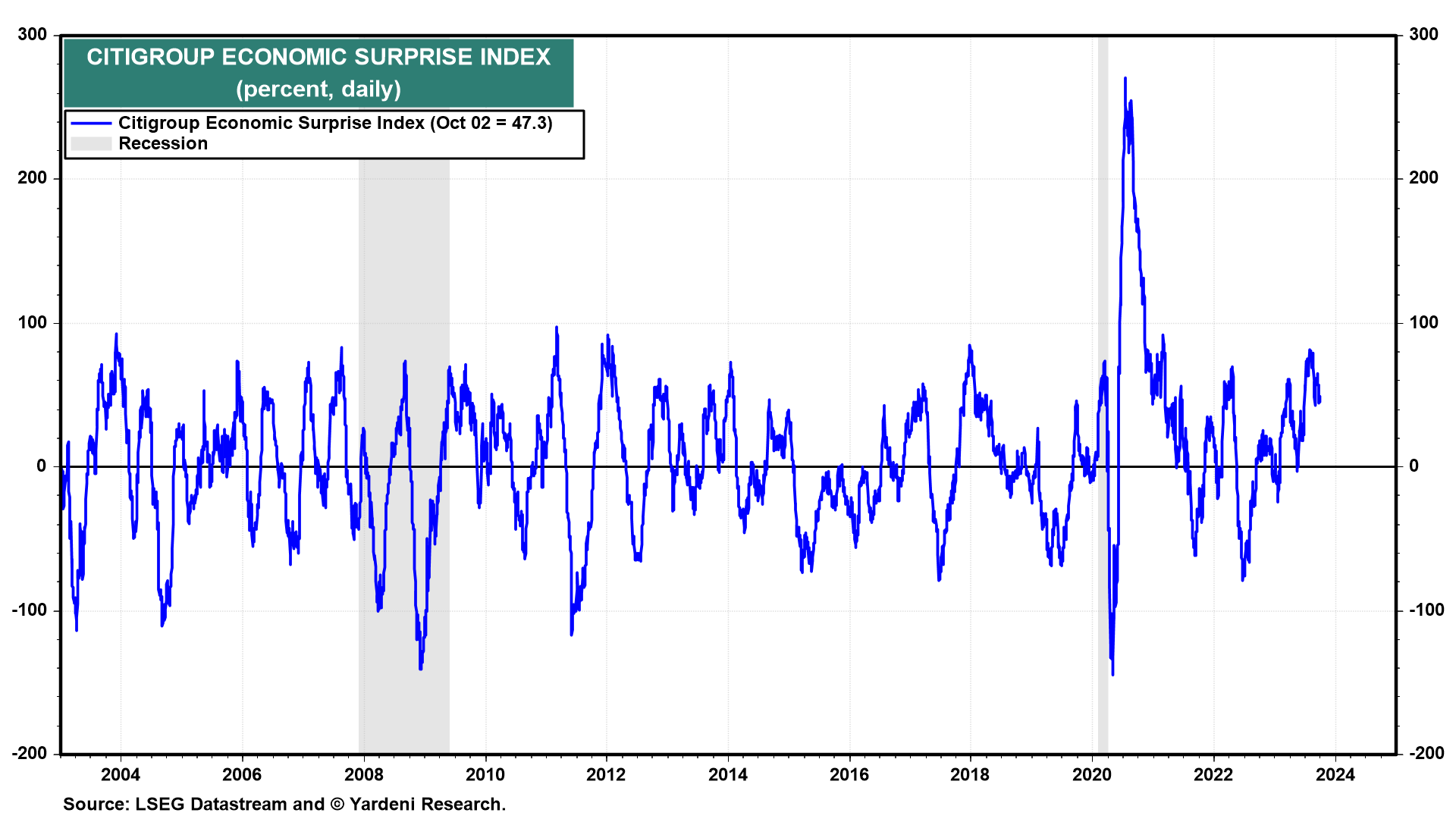 The 10-year Treasury bond yield should have declined on the news since its 13-week change tends to track the CESI closely. Instead, the yield has continued to march higher, up to 4.70% this morning.